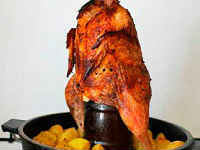 Ідея приготування в духовці смачної курки з хрусткою скоринкою на пляшці цілком, стара, як світ.