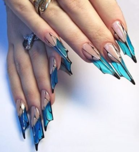 Метелик. В основі цієї форми лежить крило метелика – його можна розглянути в профіль. Виконати цей манікюр може тільки професіонал, так як його не можна випиляти – тільки наростити, відразу надаючи потрібні обриси. Як у випадку з варіантами, зазначеними вище, «метелика» не слід носити щодня. Навіть не до всякого торжества підійде такий екстравагантний спосіб.