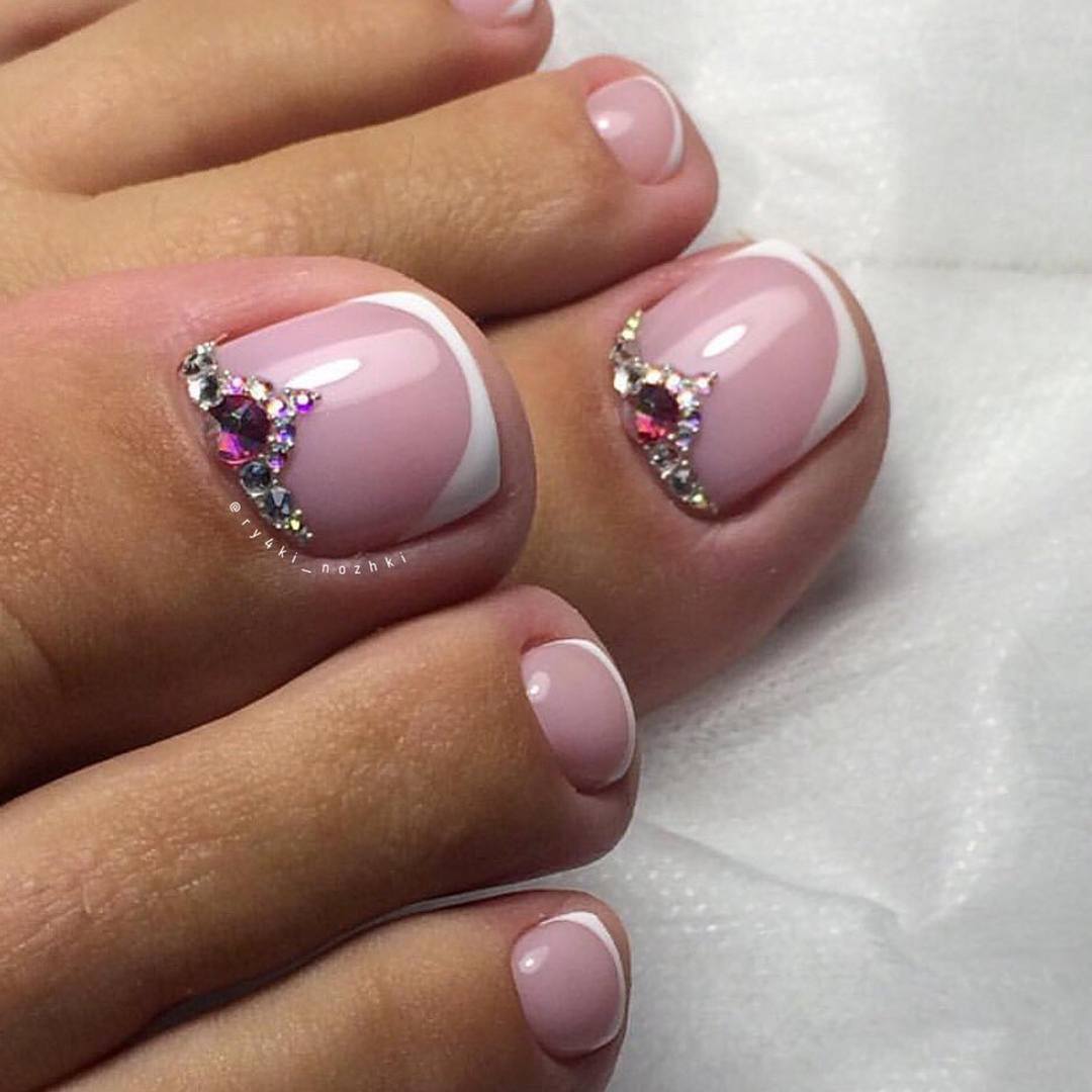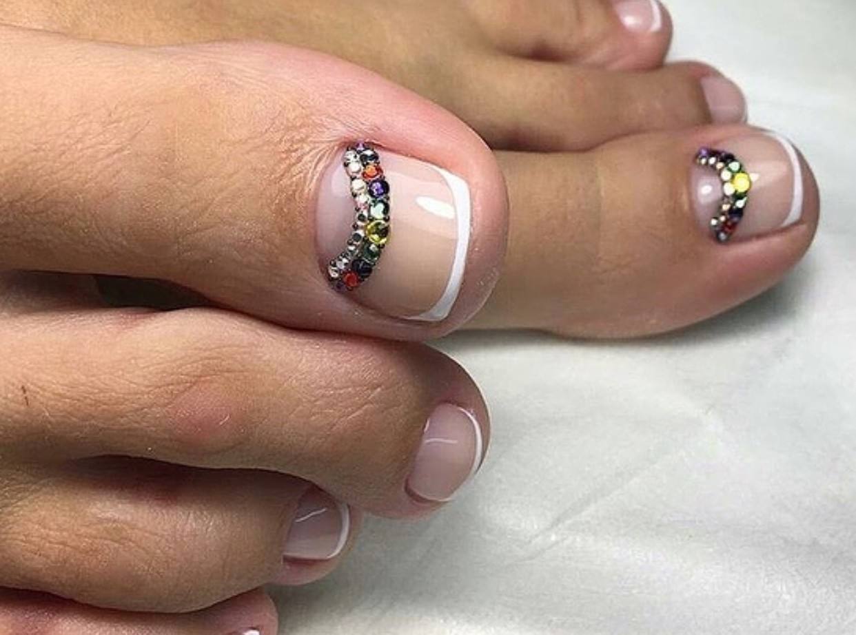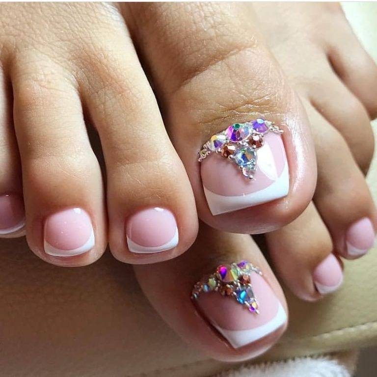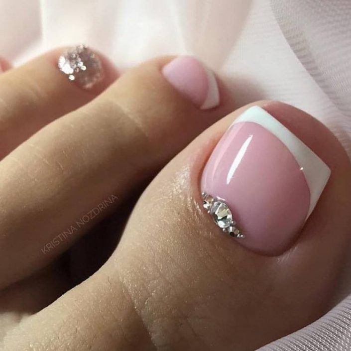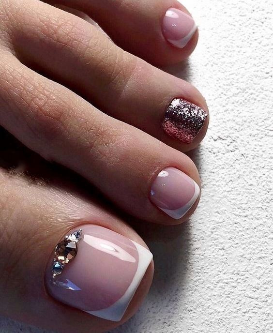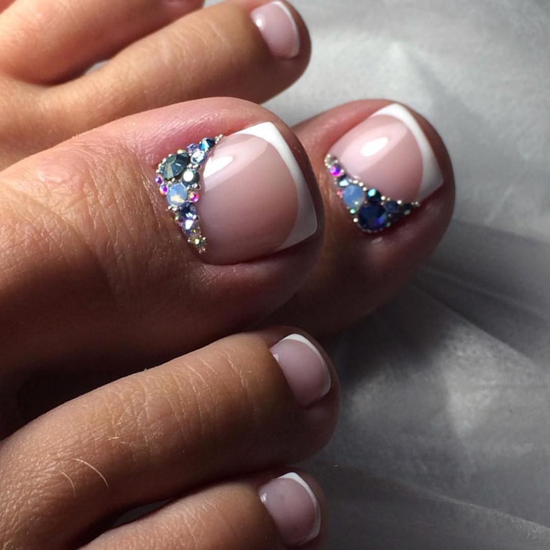 Для виконання більш привабливих варіацій педикюру не обійтися в цьому сезоні без всіляких каменів, страз і різноманітних блискіток. Всі ці елементи можна використовувати в педикюрі окремо або всі одночасно, тільки не забувайте, що в нашому випадку красиво – не значить нав’язливо. Яскравими акцентами можна виділяти лінію посмішки, створювати оригінальні візерунки, застосовувати поодинокі акценти на нігтиках або повністю покривати один-два пальчика. В якості основного покриття вам послужать не тільки прозорі підстави. Стрази, блискітки і камінчики дуже красиво виглядають на будь-якому колірному рішенні.