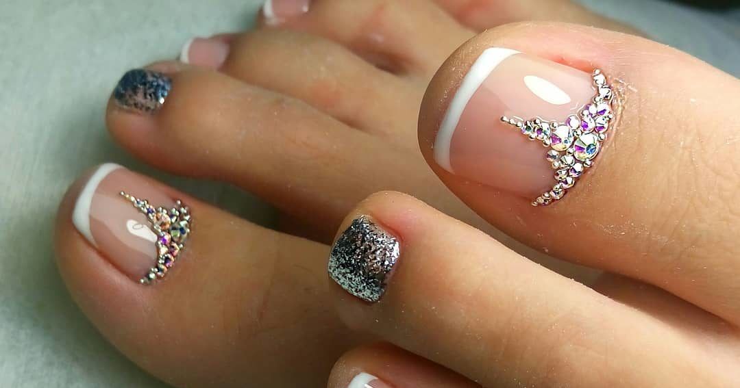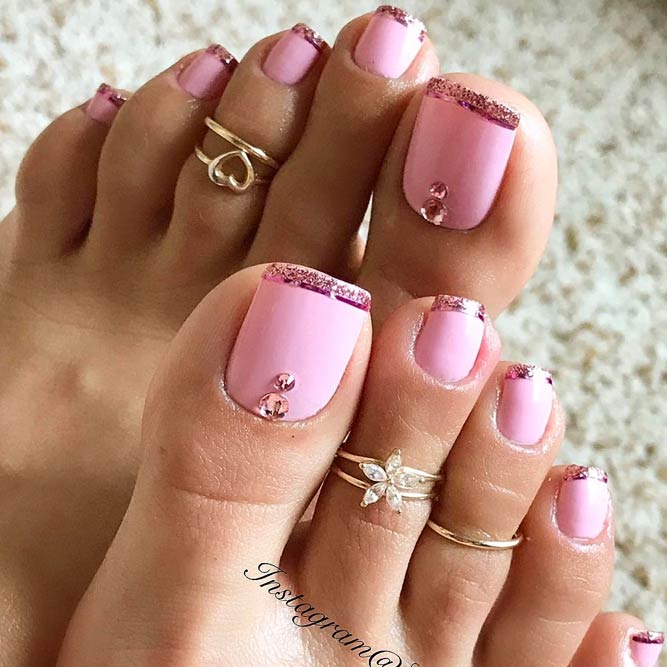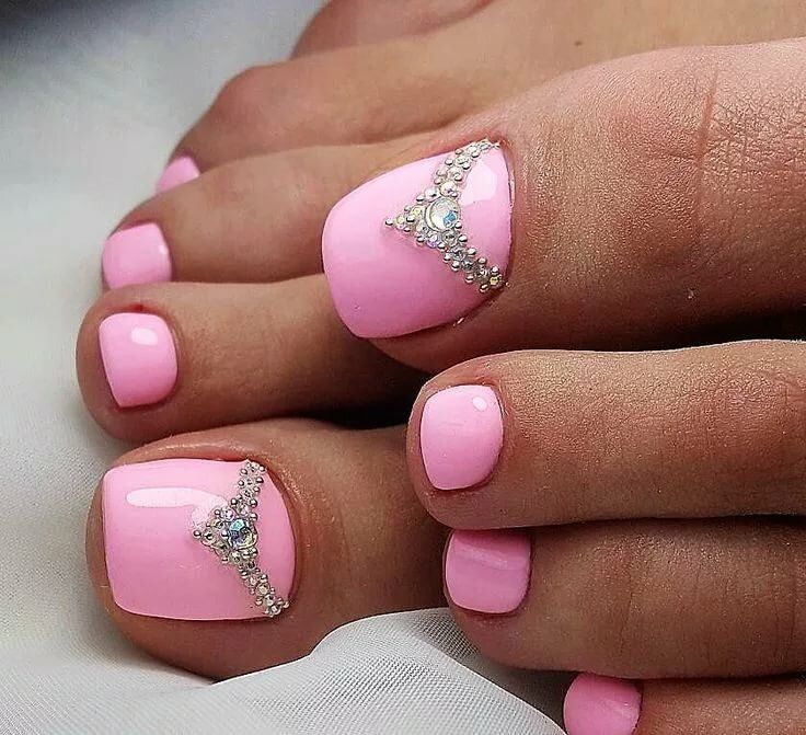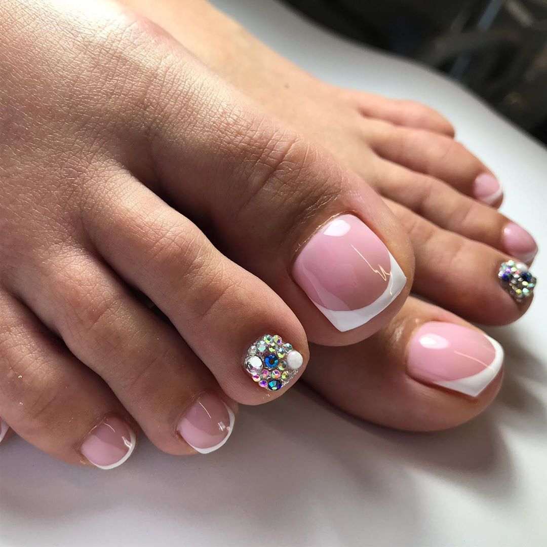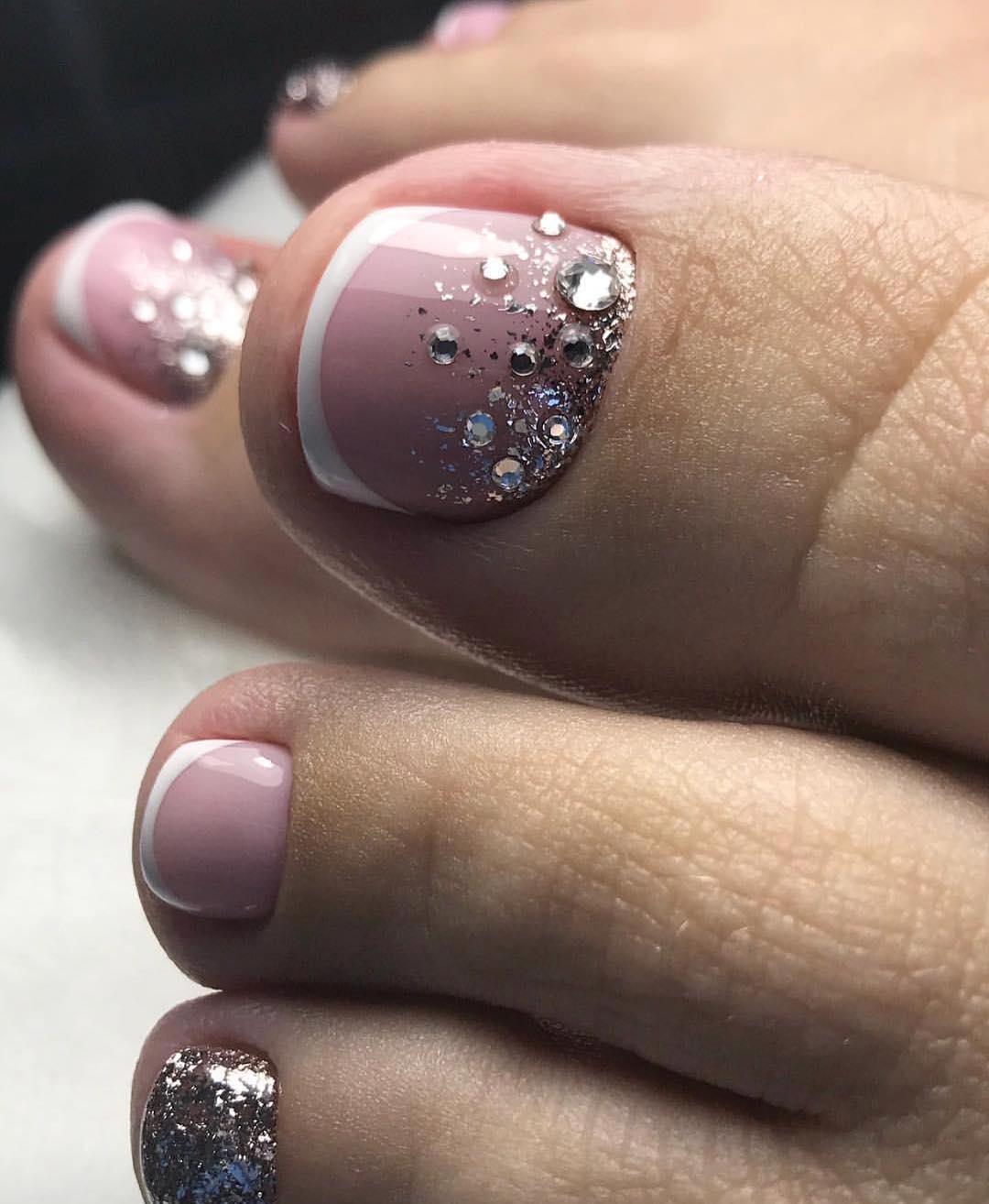 Для виконання більш привабливих варіацій педикюру не обійтися в цьому сезоні без всіляких каменів, страз і різноманітних блискіток. Всі ці елементи можна використовувати в педикюрі окремо або всі одночасно, тільки не забувайте, що в нашому випадку красиво – не значить нав’язливо. Яскравими акцентами можна виділяти лінію посмішки, створювати оригінальні візерунки, застосовувати поодинокі акценти на нігтиках або повністю покривати один-два пальчика. В якості основного покриття вам послужать не тільки прозорі підстави. Стрази, блискітки і камінчики дуже красиво виглядають на будь-якому колірному рішенні.