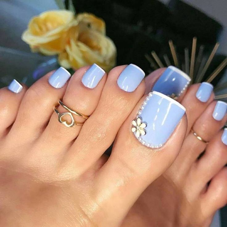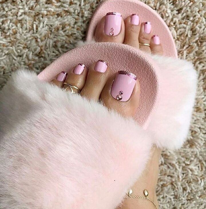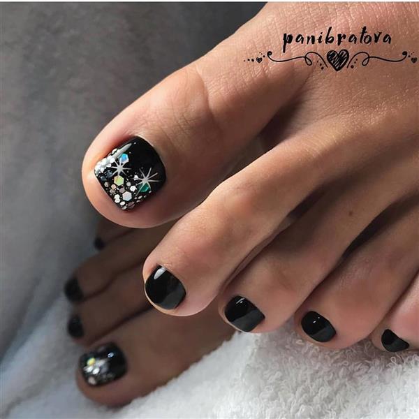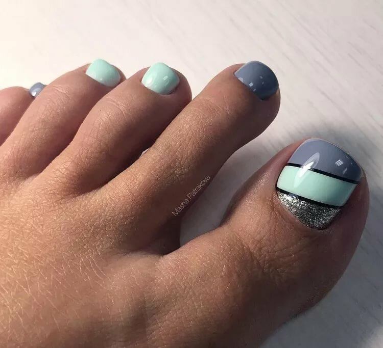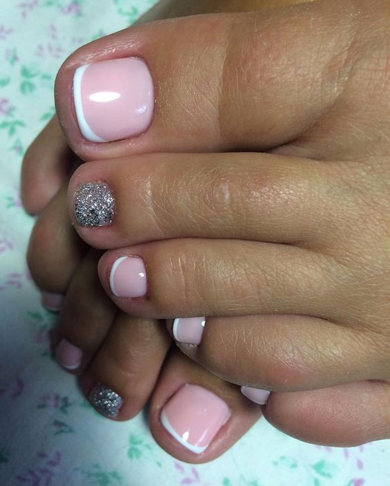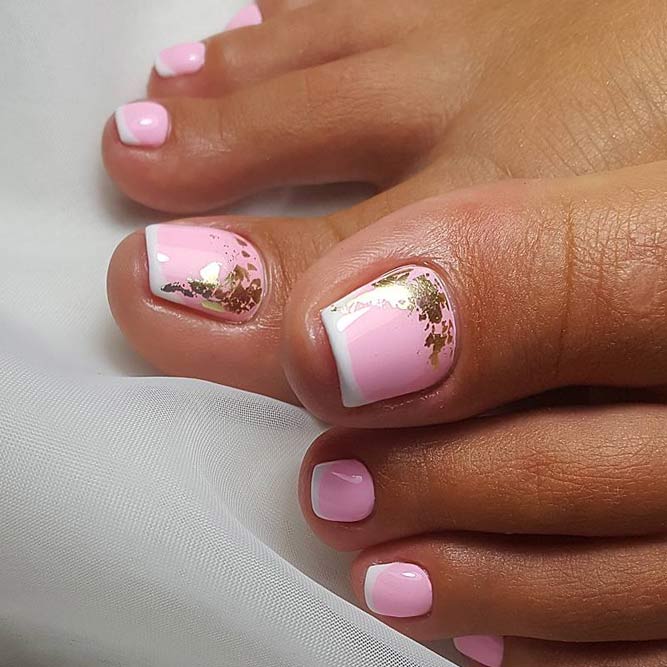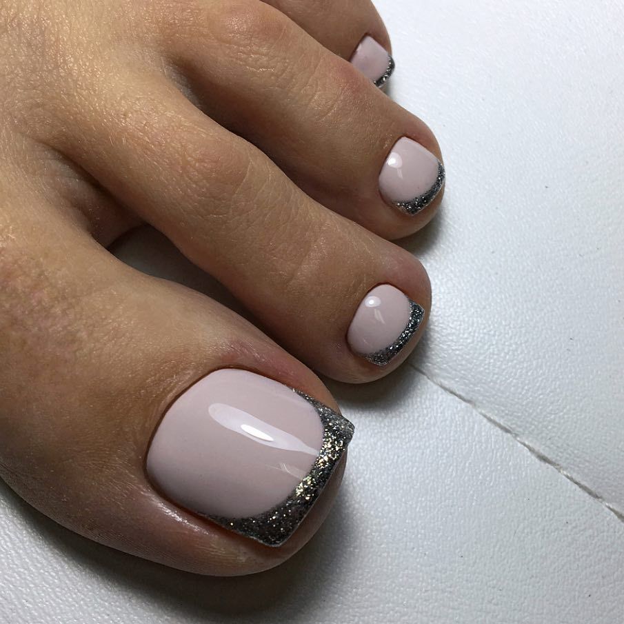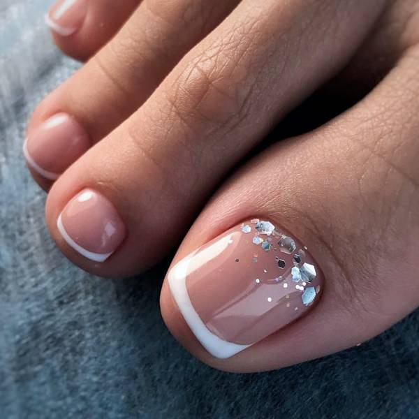 Витончений блиск фольги дуже актуальне для всіх новомодних дизайнів нігтьових пластин в цьому сезоні і є одним із затребуваних варіантів французького педикюру. Декор фольгою можна наносити, як тільки на великі пальчики, так і на всі нігтики на ніжках. Блискучі елементи однаково добре виглядають в повсякденному педикюрі і в якості доповнення образу для особливих випадків.