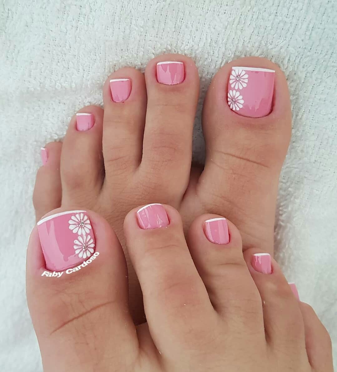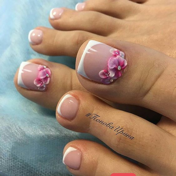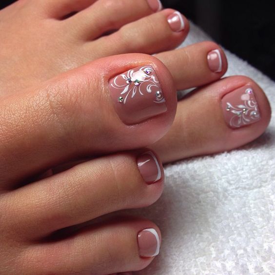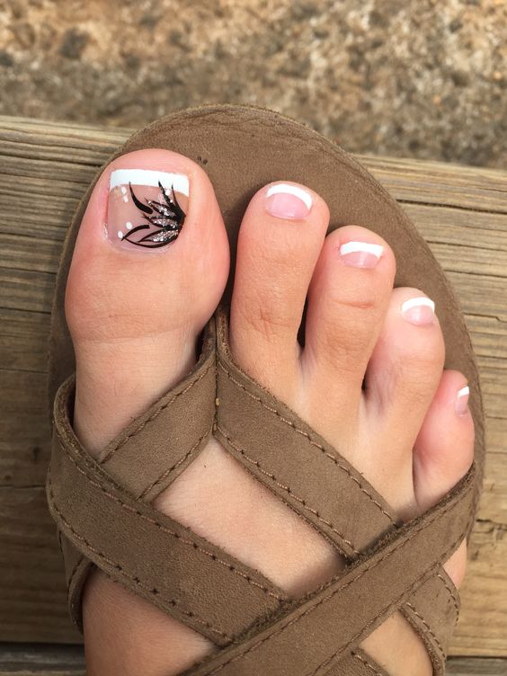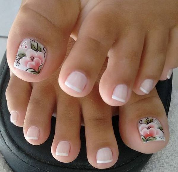 Неймовірно ніжно і вишукано виглядають різноманітні малюнки в дизайні френч педикюру. Можна наносити зображення на одному з пальчиків або виділяти лінію посмішки ажурними візерунками. Малювати на нігтьових пластинах квіткові мотиви, сердечка, геометричні фігури або різні інші ескізи. Вітаються для такого дизайну мініатюрні малюнки в стилі мінімалізм і поєднання з елементами блискучого декору.