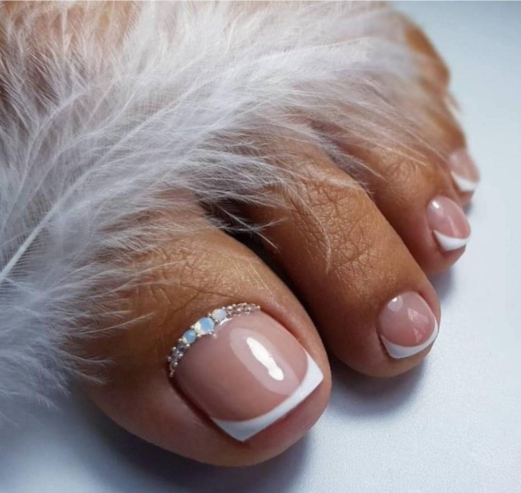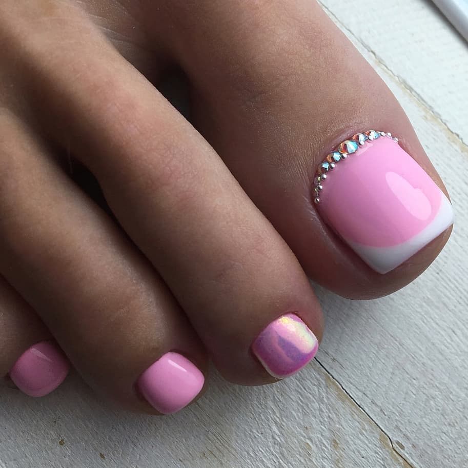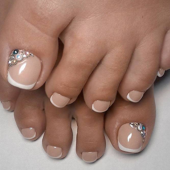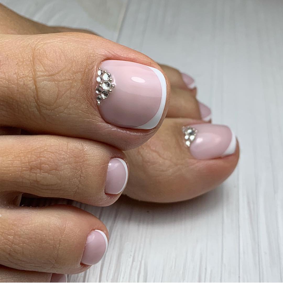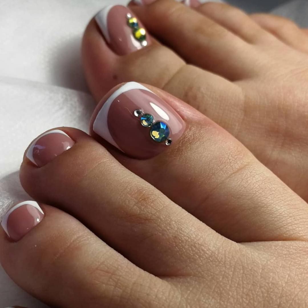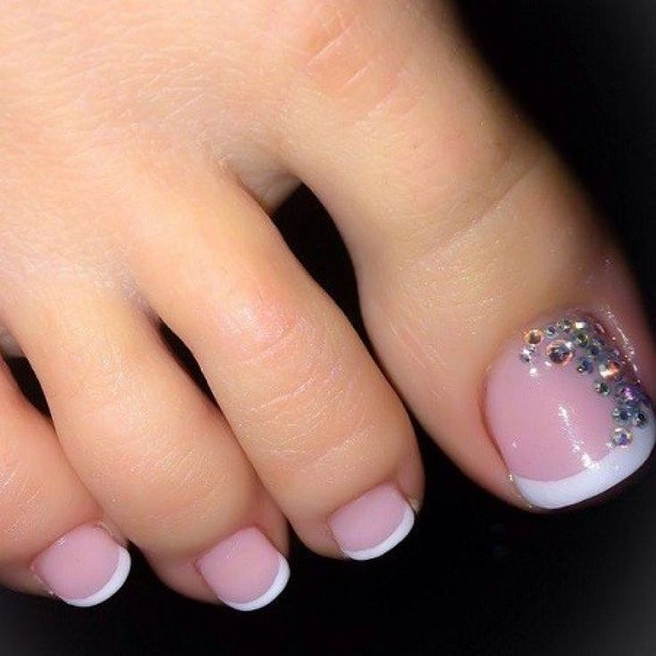 Також однією з трендових ідей для французького педикюру цього модного сезону став варіант оформляти в цій техніці тільки нігтьові пластини великих пальчиків на ніжках. Інші нігтики покриваються однотонним покриттям або будь-яким дизайном, який доведеться вам до душі. Актуально доповнювати акцентні нігтики стразами, ліпленням, або будь-яким іншим декором.