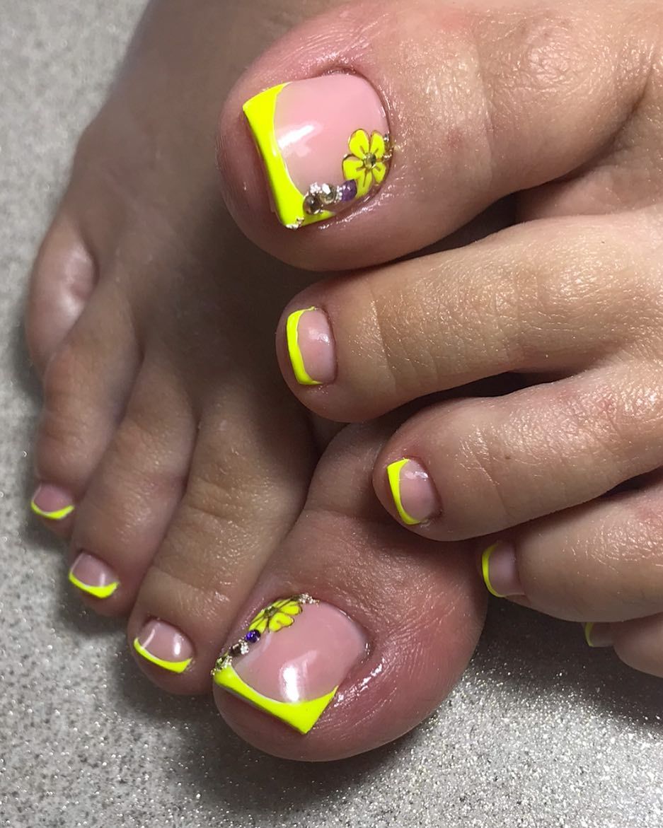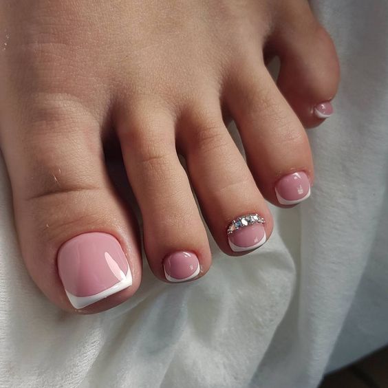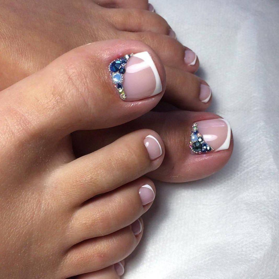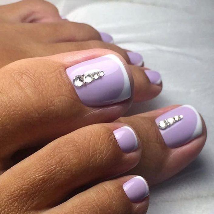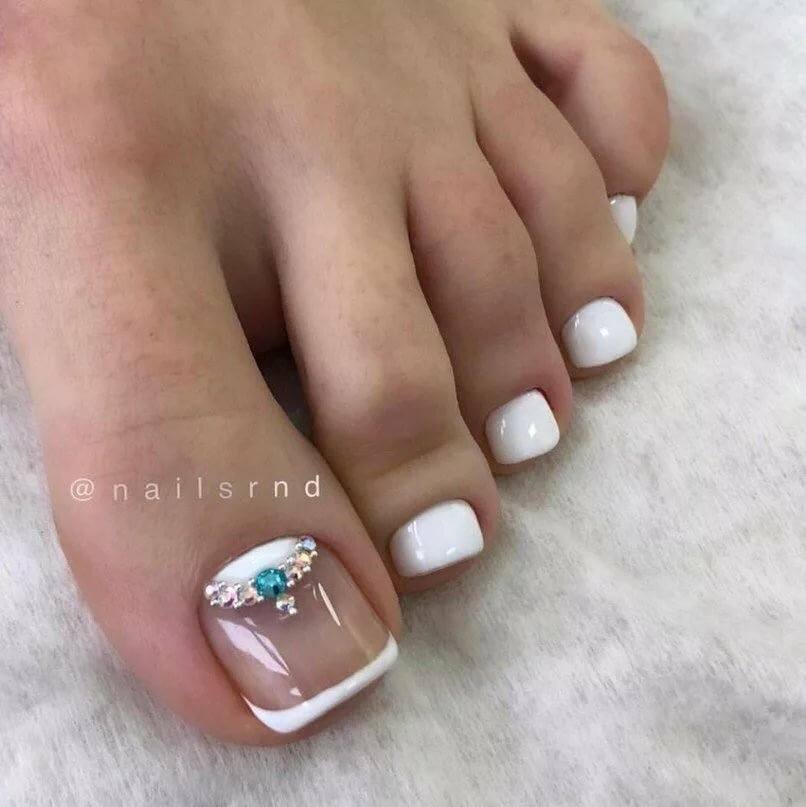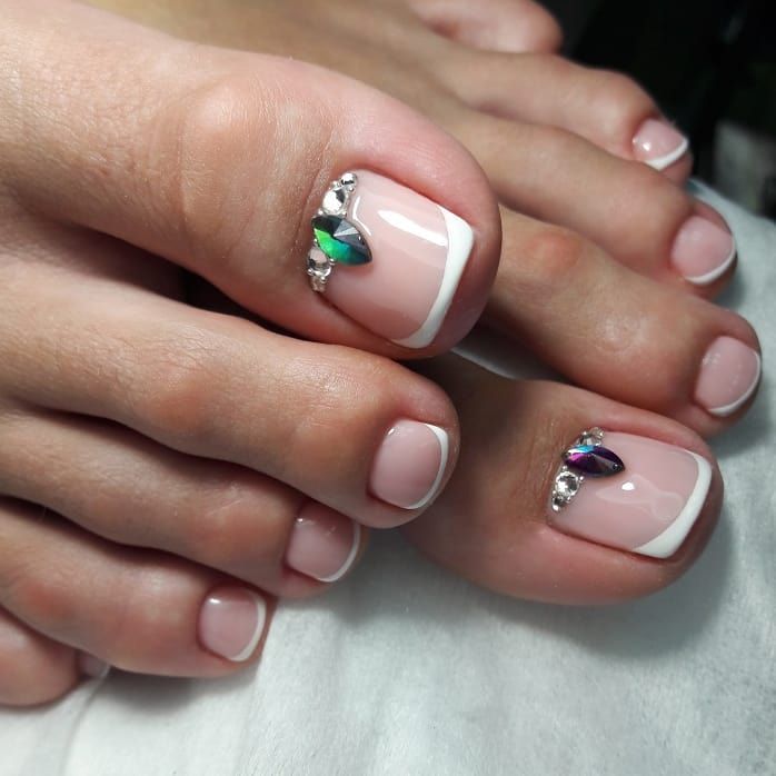 Також однією з трендових ідей для французького педикюру цього модного сезону став варіант оформляти в цій техніці тільки нігтьові пластини великих пальчиків на ніжках. Інші нігтики покриваються однотонним покриттям або будь-яким дизайном, який доведеться вам до душі. Актуально доповнювати акцентні нігтики стразами, ліпленням, або будь-яким іншим декором.