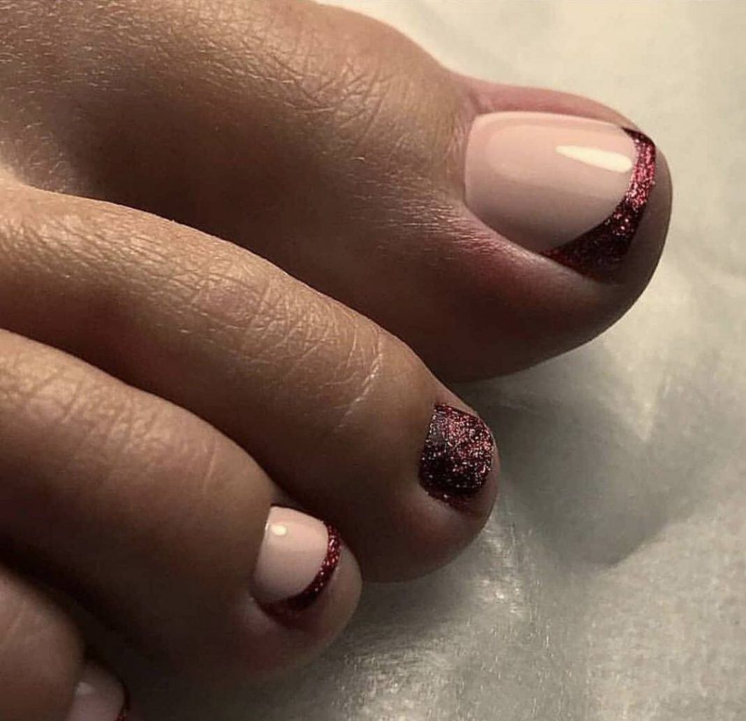 Просто чудово виглядає на пальчиках модний французький педикюр з захопливим оксамитовим ефектом. У цьому модному сезоні актуальні численні нюдовые відтінки, красивий яскраво-червоний колір та інші варіанти кольорів. Блискуча крапелька, виконана глітером, або будь-яким блискучим декором стане дуже до речі в такому трендовому френч педикюрі і доповнить витонченим акцентом ваші пальчики на ніжках.