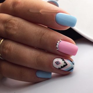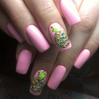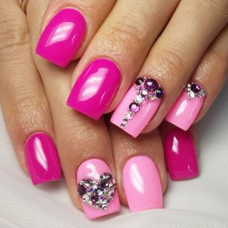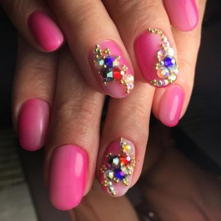 Стрази на ніжно рожевому кольорі виглядають просто чудово. Рекомендується використовувати і великі, і малі, і середні каміння, а також прозорі та кольорові стрази. Модними вважаються: рожевий манікюр зі стразами по фен-шуй в поєднанні з блакитним кольором і геометричними малюнками; рожевий дизайн нігтів з малюнком ананаса який прикрашений різнокольоровими стразами; манікюр в рожевому кольорі з метеликом і стразами різної форми, розміру і кольору.