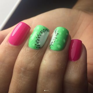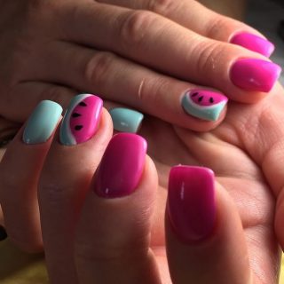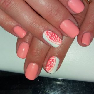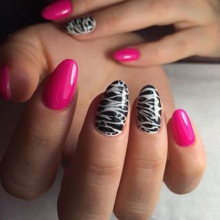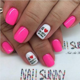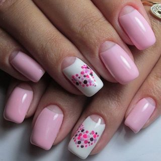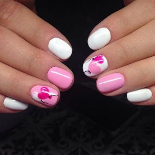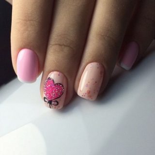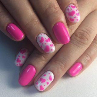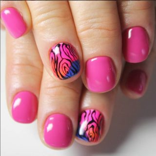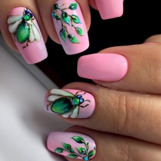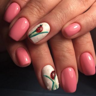Малюнки на рожевому тлі виглядають органічно. Можна виконувати малюнки в різних кольорах. Найкраще з рожевим поєднуються наступні кольори: жовтий, червоний, білий, зелений. Красиво виглядає рожевий манікюр з малюнком сонечка на траві з росою. Яскраво виглядають манікюр з малюнками цитрусових. Цікавий варіант рожевого манікюру з малюнками — малюнки сердечок на білому тлі. Всі найкрасивіші варіанти такого манікюру зібрані нижче.