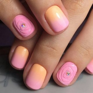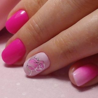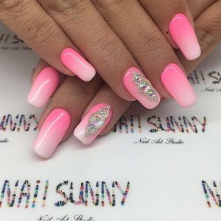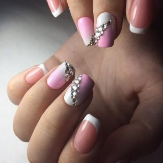 Градієнтний рожевий манікюр чудово переходить в білий. Таким чином можна обіграти і французький манікюр. Омбре на нігтях рожевого кольору відмінно виглядає з великими і великими стразами; з трояндами і одним каменем по центру; з маленькими стразами по контуру безіменних пальців; звичайний перехід з рожевого в білий без будь-якого декору та інших заморочок.