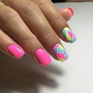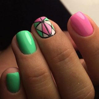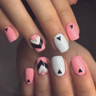 Геометричні малюнки виглядають строго і стримано на нігтях будь-якого кольору. Рожевий не став винятком. Представляємо вашій увазі кілька варіантів рожевого геометричного манікюру. Зверніть увагу на перший манікюр. Він дуже яскравий і світлий. Те що потрібно для гарного настрою.