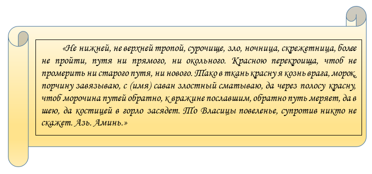 Беруть шматок червоної тканини і ніж. Після заходу йдуть у ліс, знаходять осику. Якщо ставлять захист на іншу людину, він повинен піти разом з вами. Розривають матерію на 5 шматків. Перший шматок тканини зав’язують у вузол на правій нозі нижче коліна. Вимовляють: