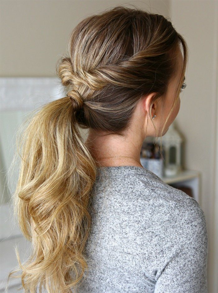 Це сама проста і практична зачіска, яка швидко виконується своїми руками. Вона надає дівчині елегантності і строгості. Таку укладку можна використовувати для всіх випадків життя. Зачіска виконується класичним способом. Але попередньо з передньої частини голови відділяється пасмо, якої в завершенні обмотується гумка, яка фіксує хвіст.