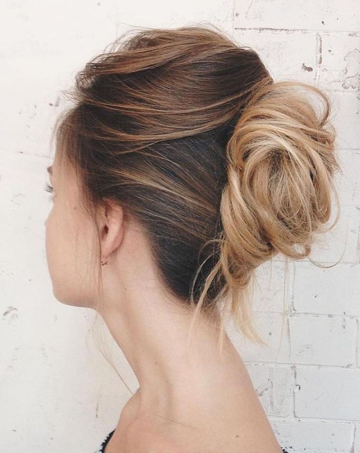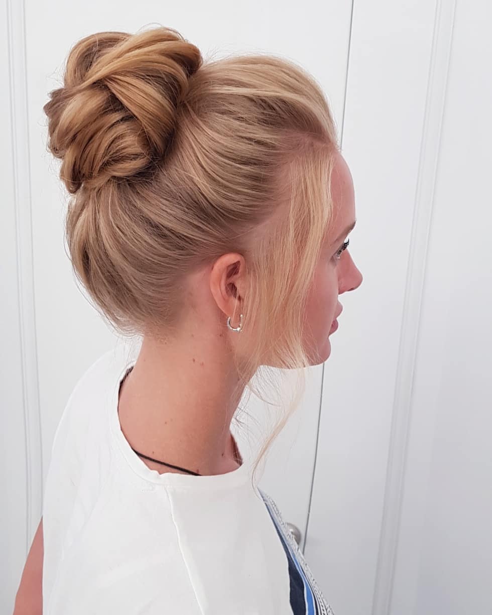 При виконанні зачіски чубчик буде досить об’ємною, що надає загальному образу пишноти і краси. Потрібно зав’язати високий хвіст з волосся, потім за допомогою валика для волосся виконується пучок. Необхідно акуратно розправити волосся на валику, щоб зачіска виглядала охайно і доглянуто. Отриманий пучок можна прикрасити за допомогою стрічок чи пов’язок.