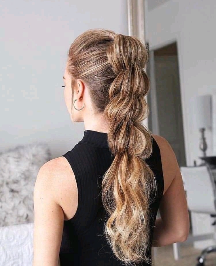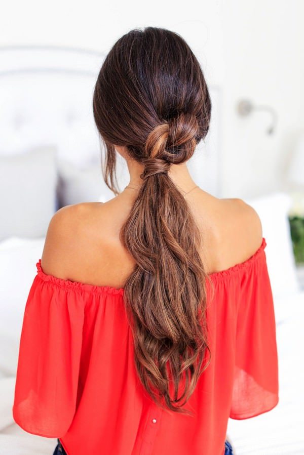 Це дуже проста і витончена зачіска для довгого волосся. Для її виконання необхідно заплести стандартний високий хвіст, відокремити від нього невелику пасмо і заплести з неї косичку. Потім обертаємо гумку виконаної кіскою і фіксуємо невидимкою. Легка і незвичайна зачіска готова.