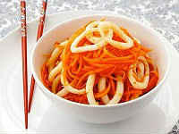 Сьогодні пропоную вашій увазі смачний салат — морквину по-корейськи з кальмарами. Приблизно пару десятиліть