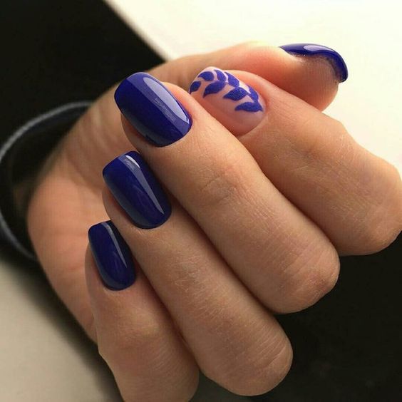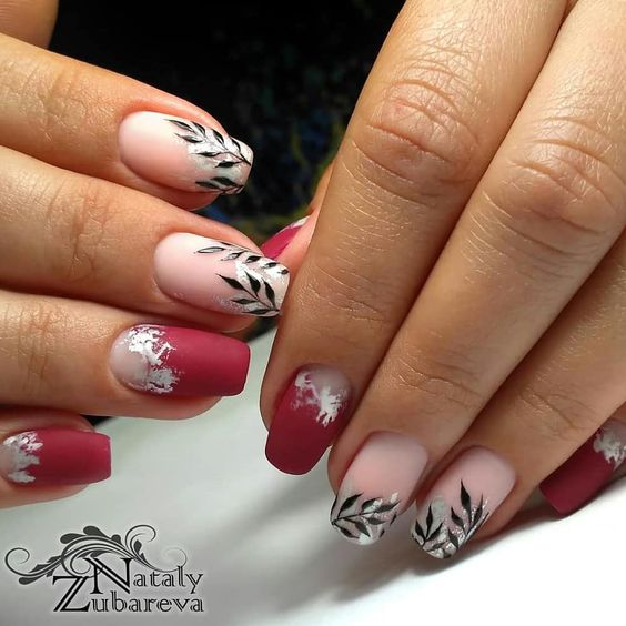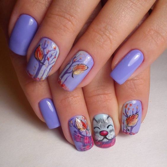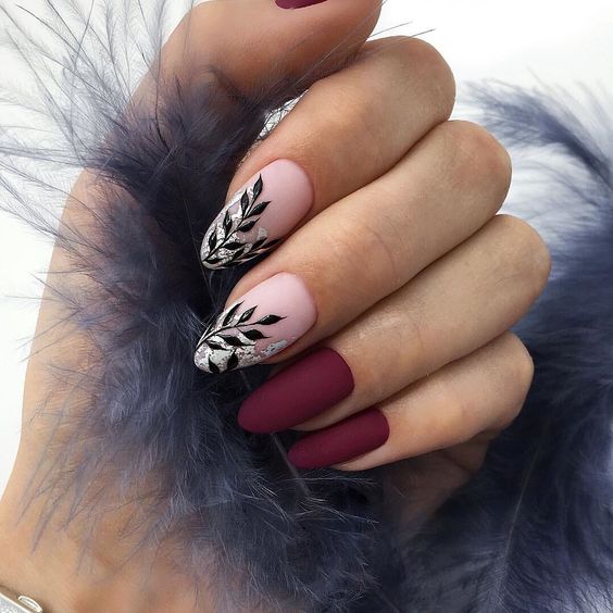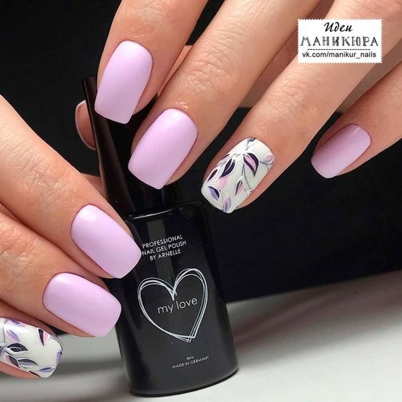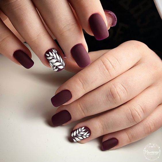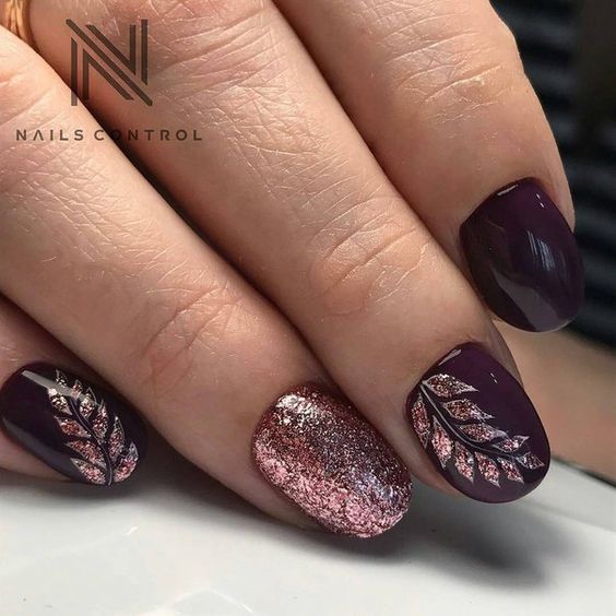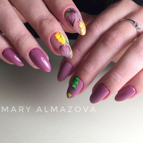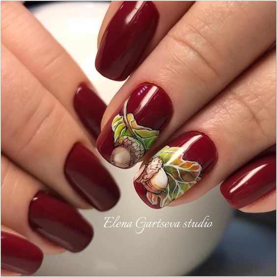 - манікюр в яскравих вишневих або бузкових тонах з одним контрастним нігтиком з листочком в колір;