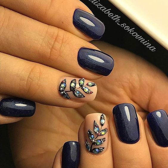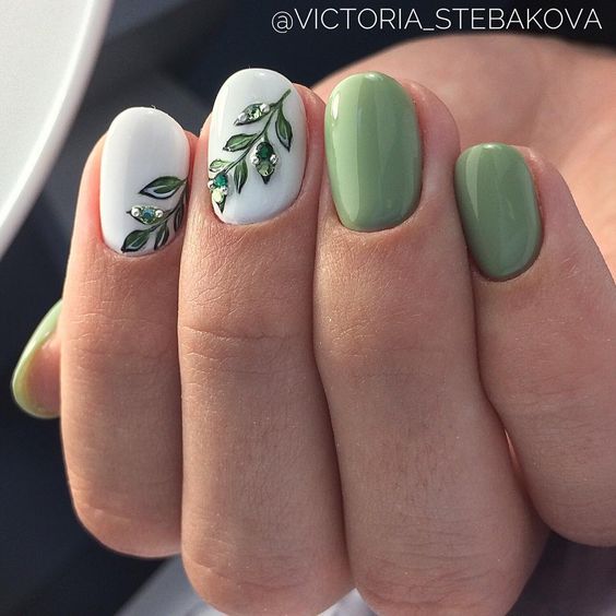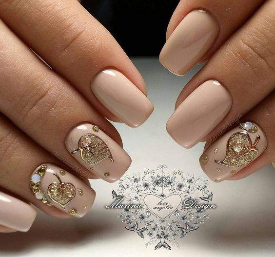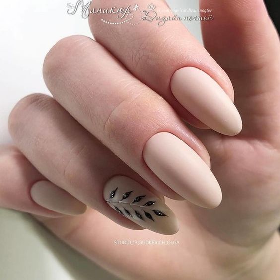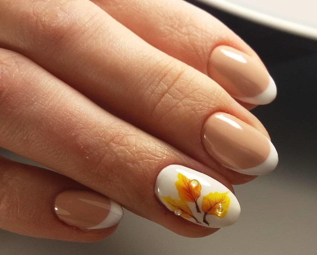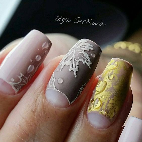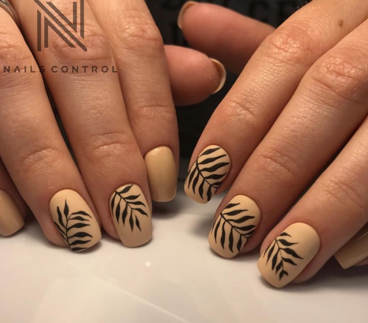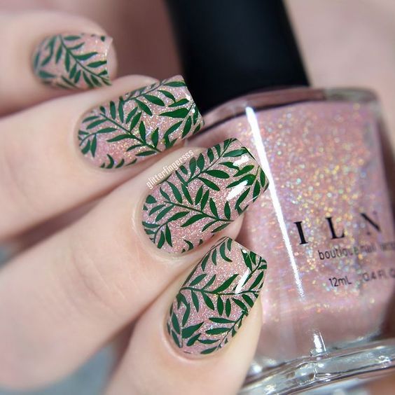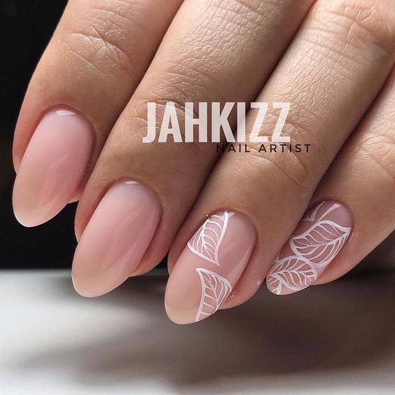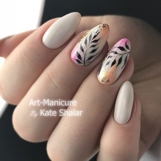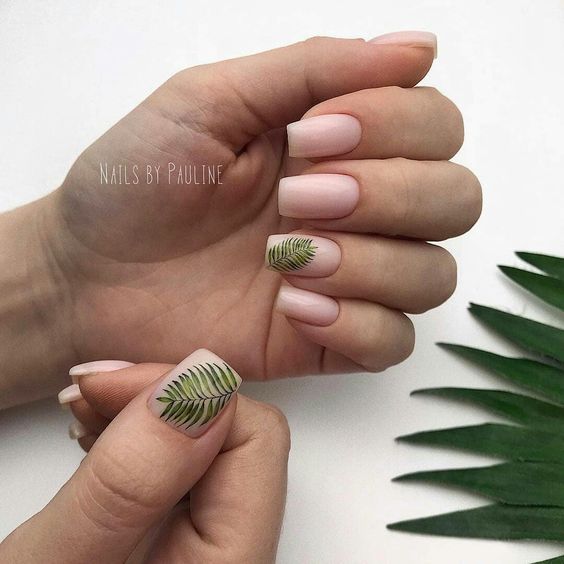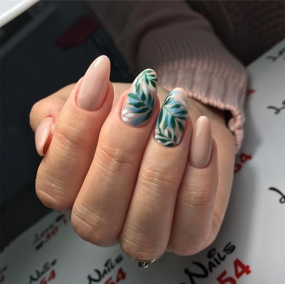 Нюдовый фон і з вишуканими літніми квітами з листочками або вишуканою гілочкою підтримає літній настрій. Повсякденний образ змінять стрази і перетворять зі звичайного нейл-арту в блискучий і святковий манікюр. Малюнок можна придумати різний і прикрасити доступними елементами декору, яких на сьогодні всіляке різноманітність. Загалом, з фантазією можна придумати ідеальний нігтьової дизайн з листям.