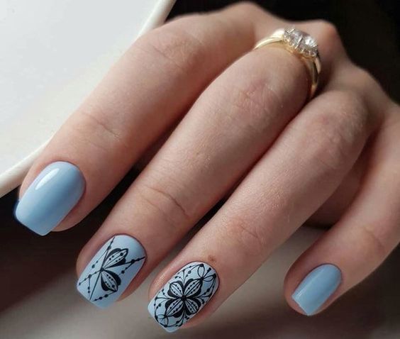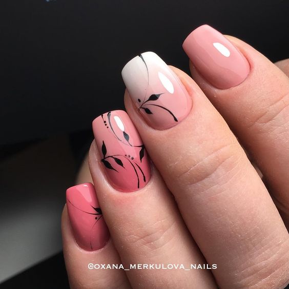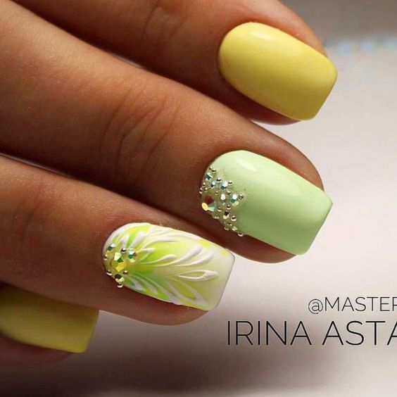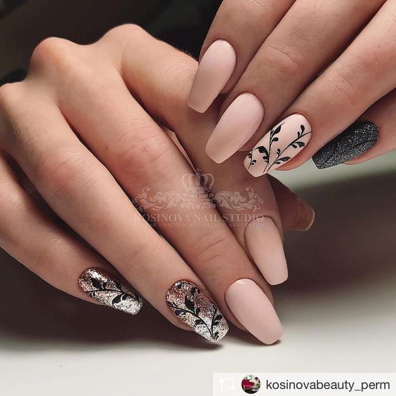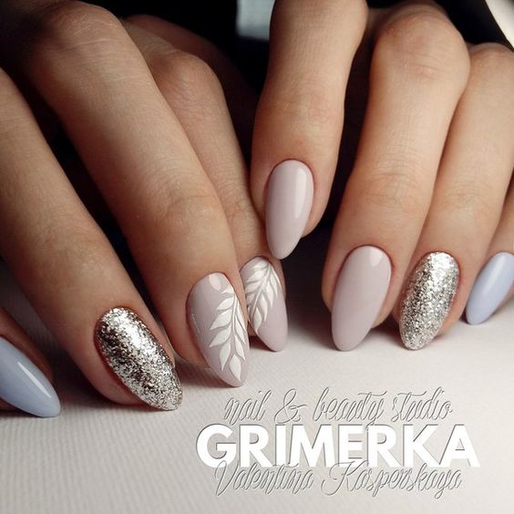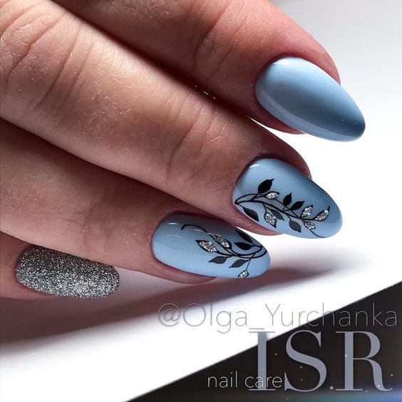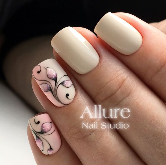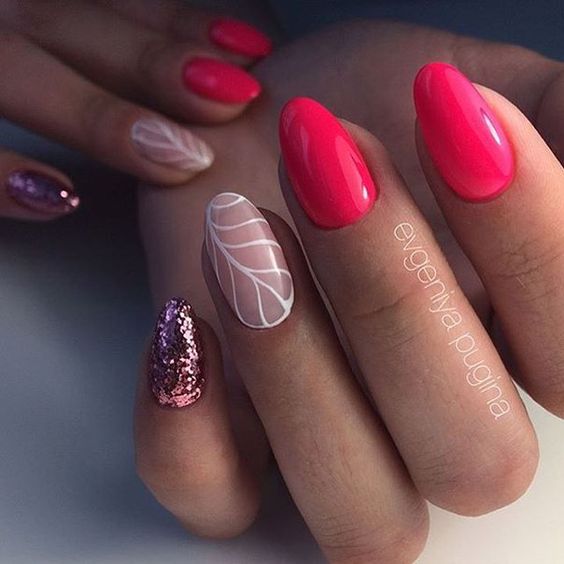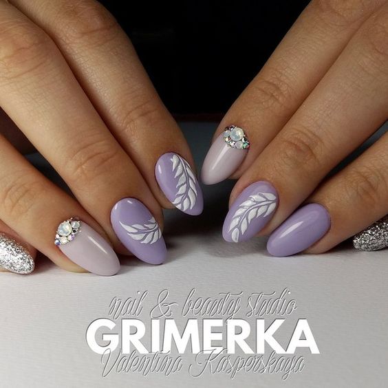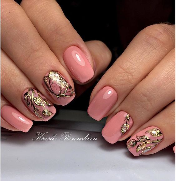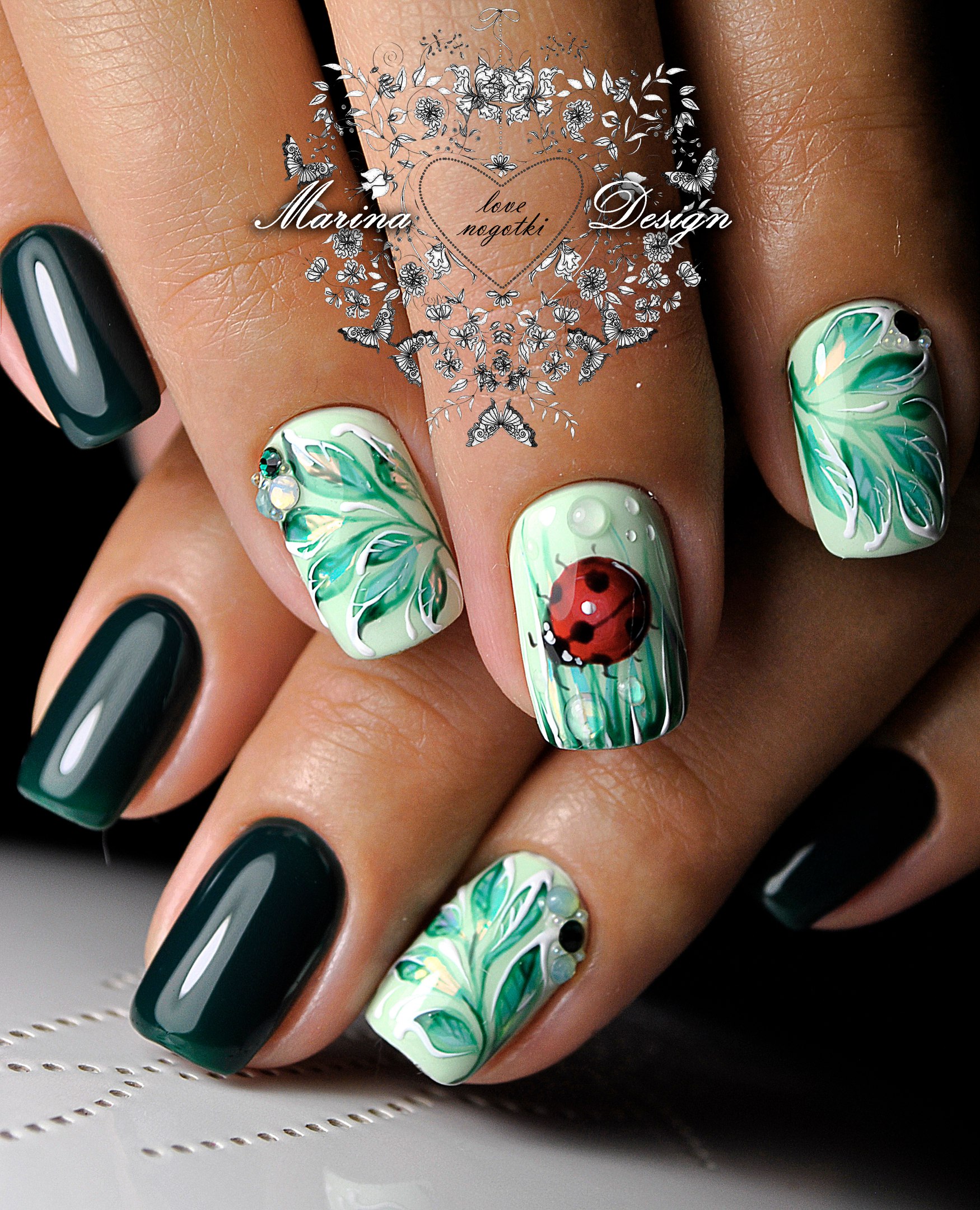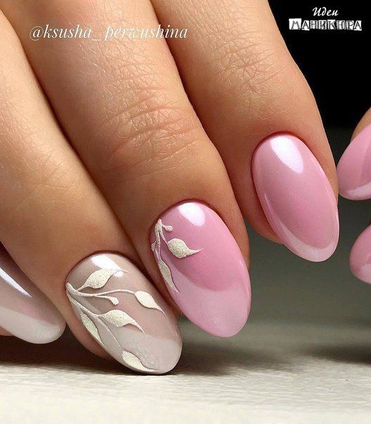 Нюдовый фон і з вишуканими літніми квітами з листочками або вишуканою гілочкою підтримає літній настрій. Повсякденний образ змінять стрази і перетворять зі звичайного нейл-арту в блискучий і святковий манікюр. Малюнок можна придумати різний і прикрасити доступними елементами декору, яких на сьогодні всіляке різноманітність. Загалом, з фантазією можна придумати ідеальний нігтьової дизайн з листям.