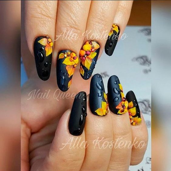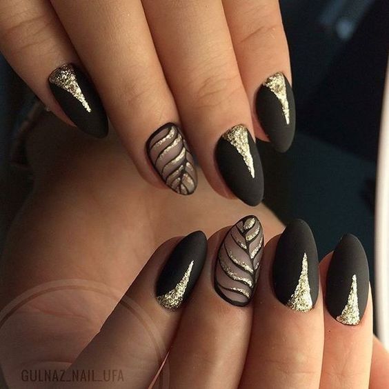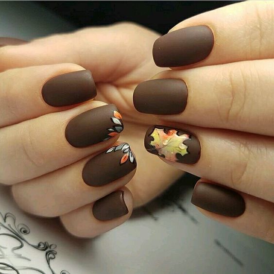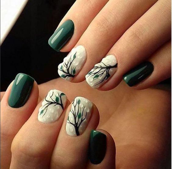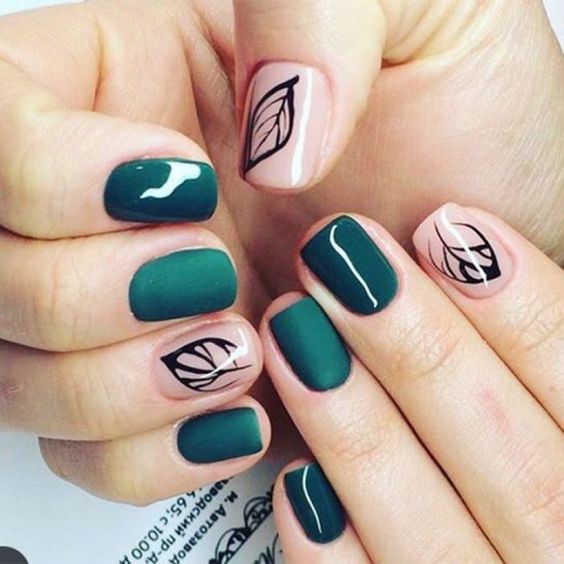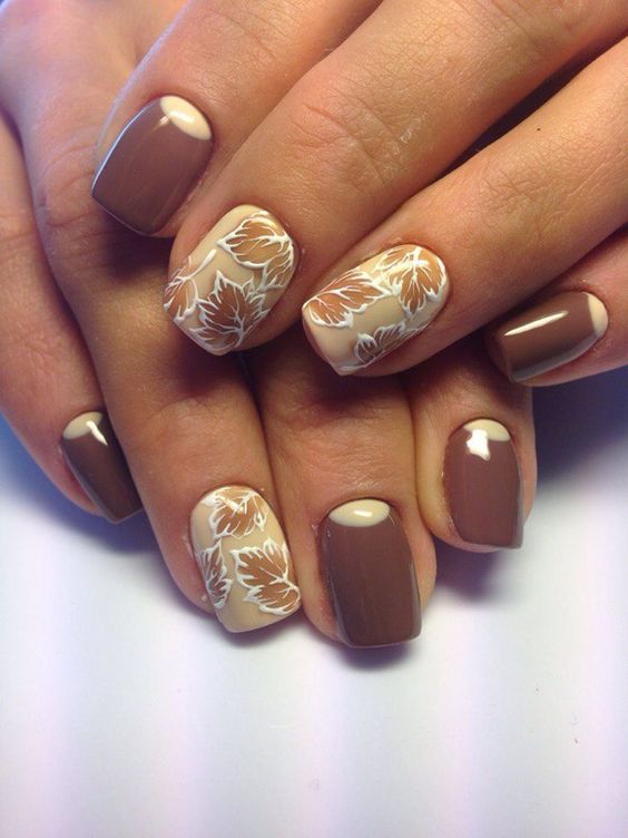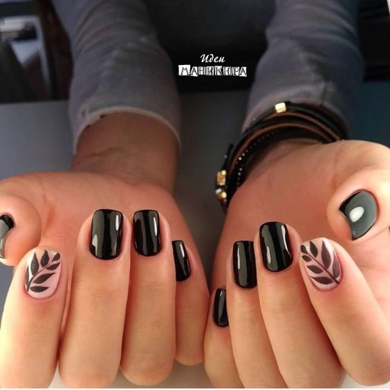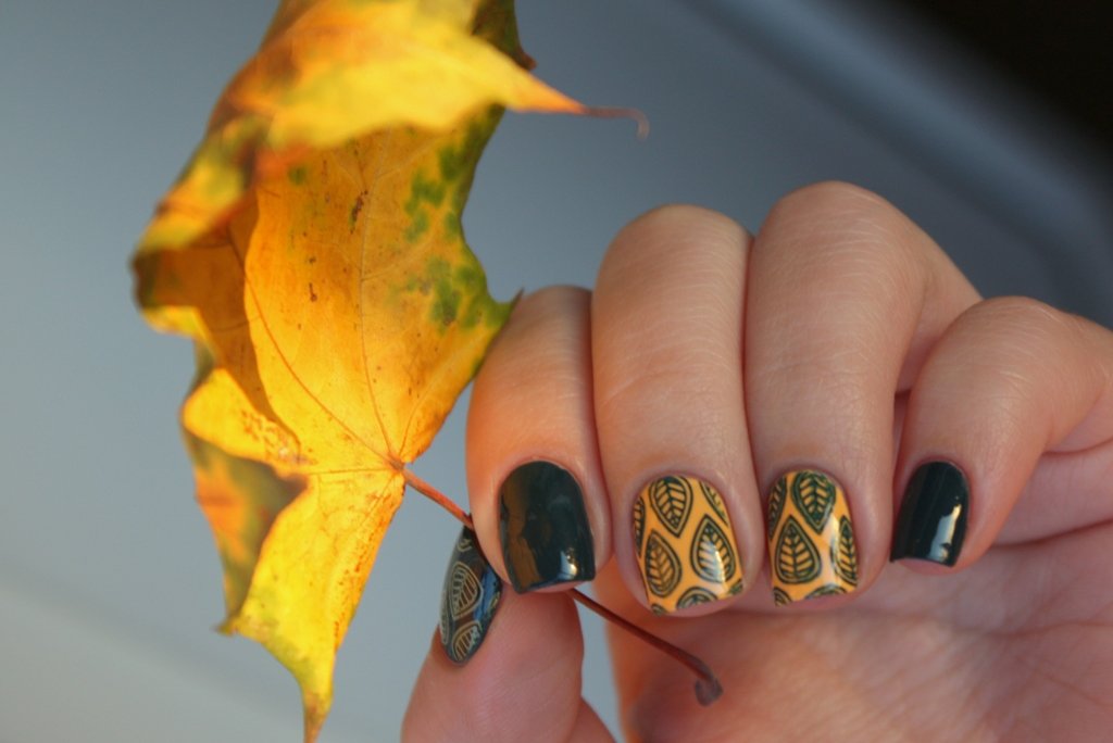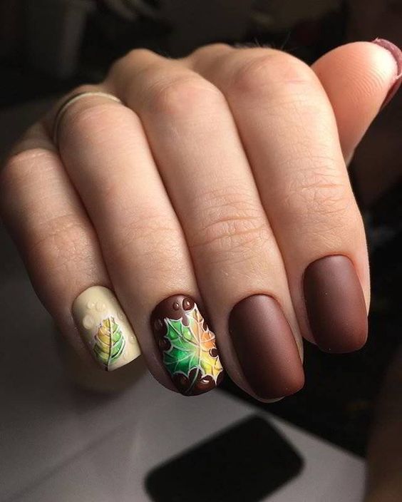 Контрастне виконання листя на нігтях виглядає дивно і ново. Щоб урізноманітнити манікюр, можна покрити два пальці темним лаком, а решту залишити в світлих тонах, на яких зобразити листочки. Це пожвавить нейл-арт. Або все можна зробити навпаки, покрити два нігтика світлими фарбами, а малюнок виконати на темних кольорах. Листочки в золотому або червоному кольорі будуть чудово поєднуватися з базовим однотонним покриттям. Пропонуємо кілька відмінних нових ідей для манікюру з листочками: