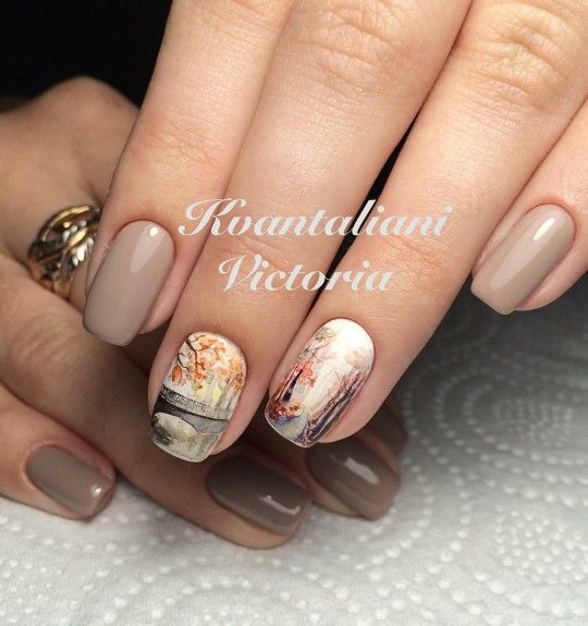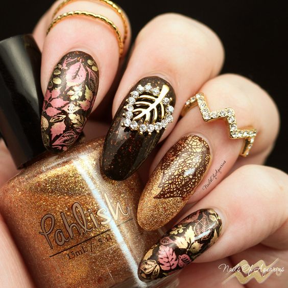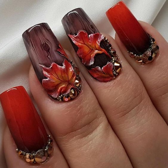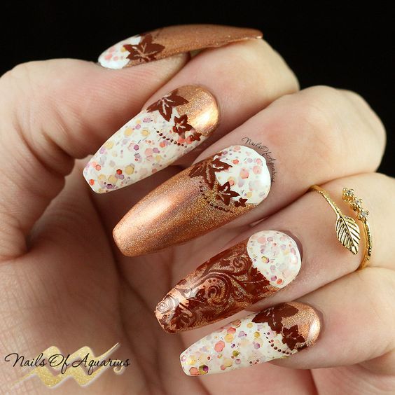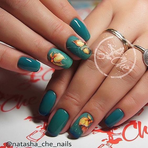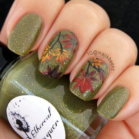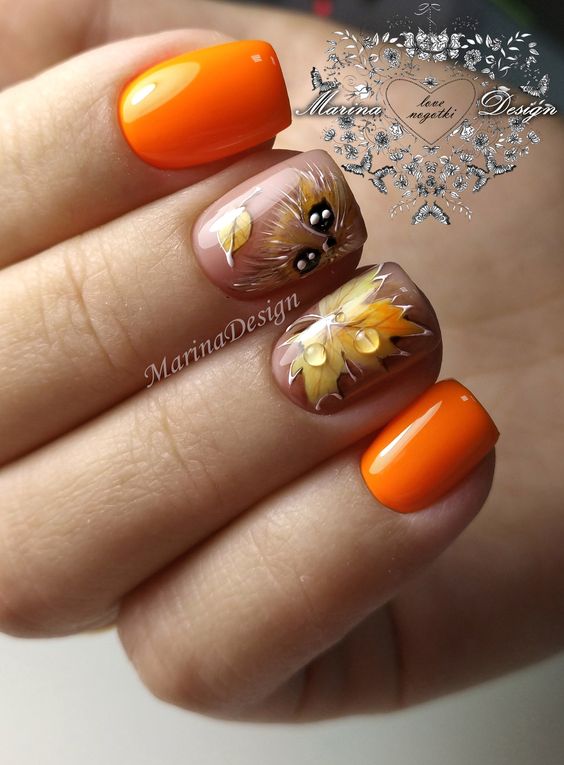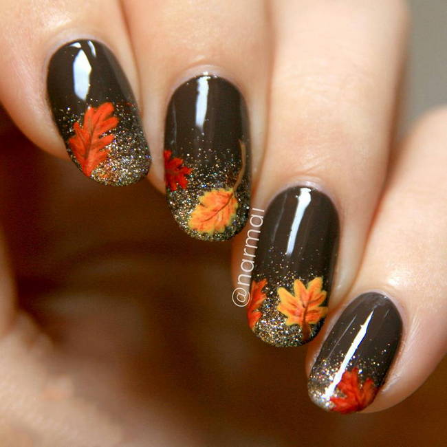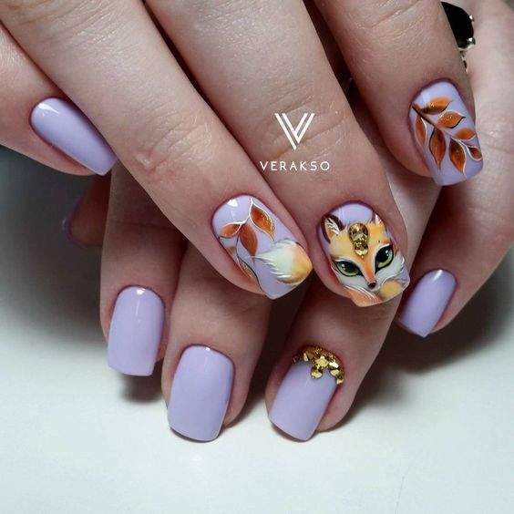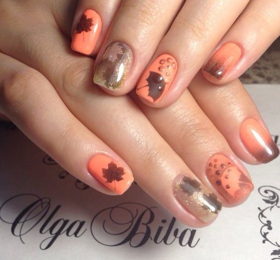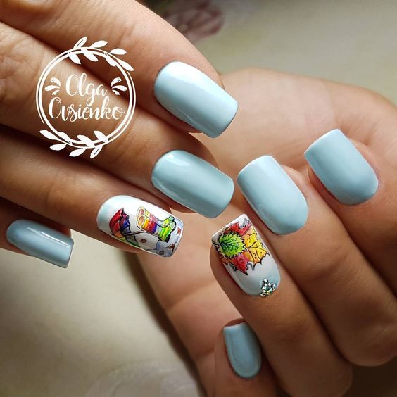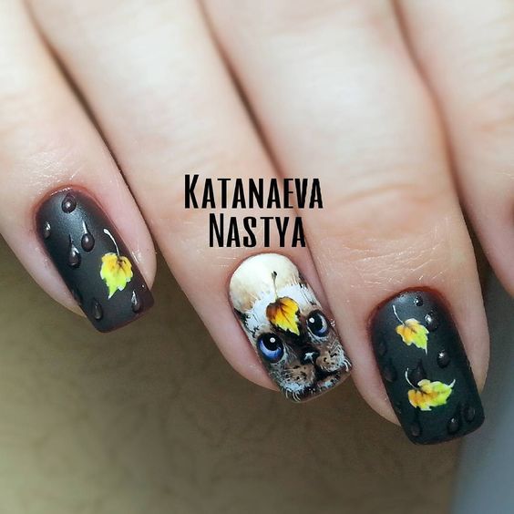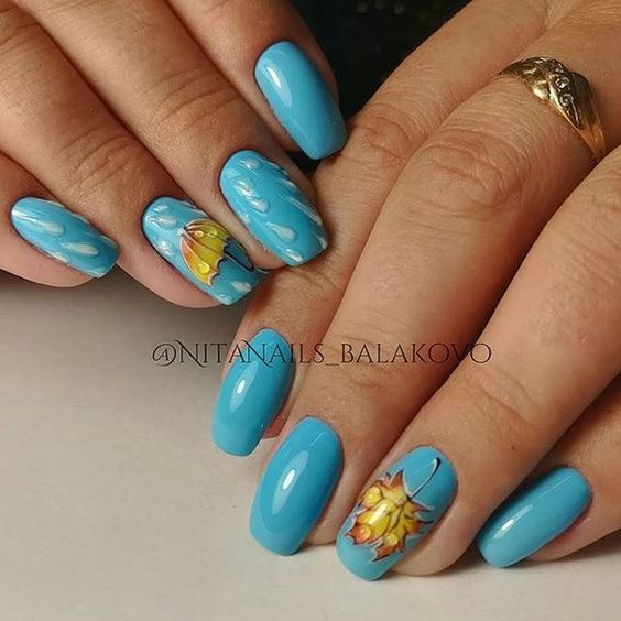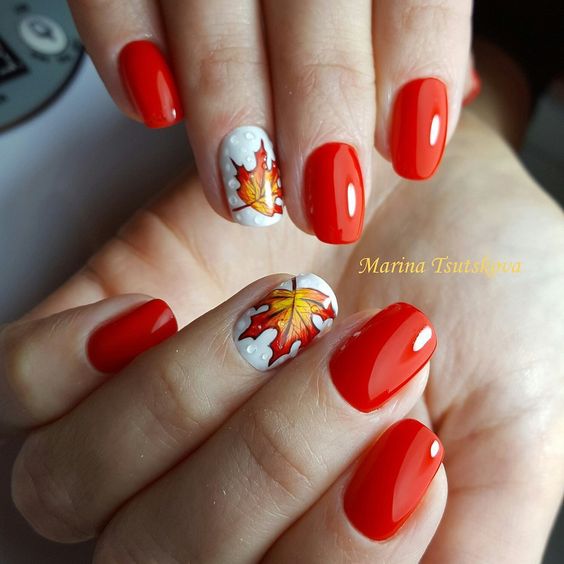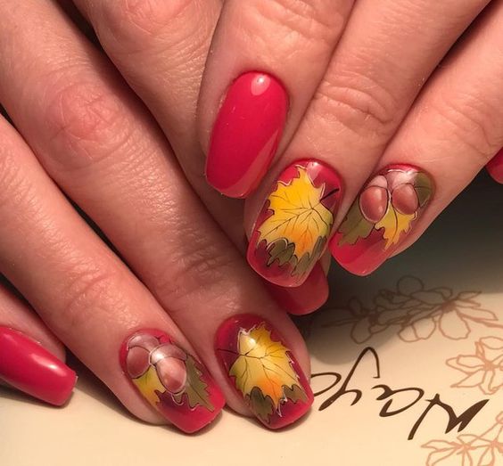 Восени набирає популярність манікюр з кленовими листочками. Цей осінній дизайн виділяється своїми вогненно-червоними і насичено яскравими тонами. Пара листочків клена, впали на кілька нагідок, стануть відмінним доповненням образу в дощовий сезон. Якщо поєднувати золотий лист з темними фарбами, наприклад, вишневими, темно – синіми або бордовими, то такий дизайн виглядає по-багатому. Звичайно, краще не навантажувати малюнок. Буде досить листочків на одному або двох нігтики. Чудовим доповненням стануть камінчики або блискітки. Всі ми добре знаємо те, що осінь — це пора дощів, тому на нігтиках буде жваво і реалістично виглядати крапельки дощу разом з кленовими листочками. Золоте, бронзове або мідне покриття нігтів прекрасно підійде для осіннього манікюру. Фольгування, блискітки або стрази будуть чудово переливатися на сонечку. Хорошою альтернативою може підійти перламутровий лак або покриття з мерехтливим наповнювачем. Руда лисичка з осіннім листям або їжачок у вогняній листі, мишка під дубовим листком… Всі ці цікаві ідеї можуть з легкістю прикрасити ваш осінній манікюр.