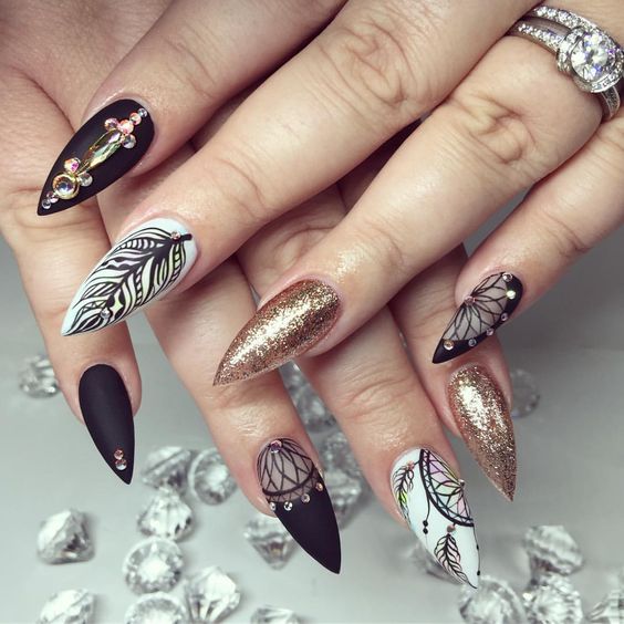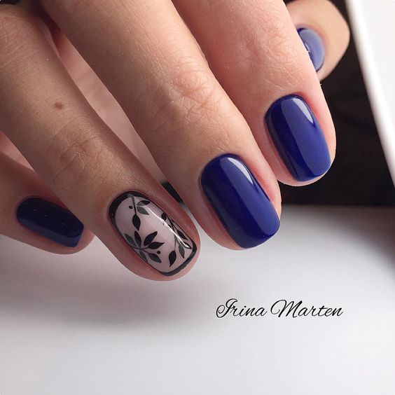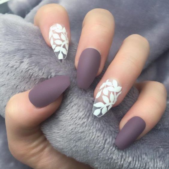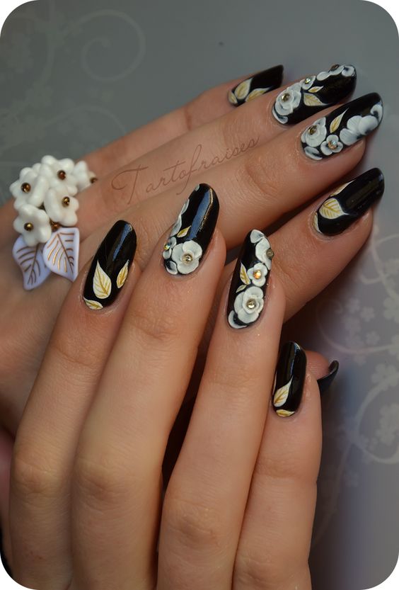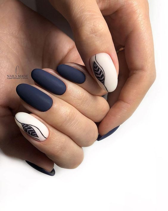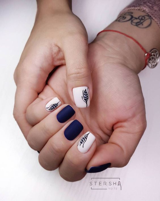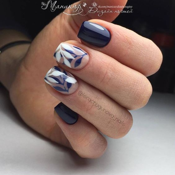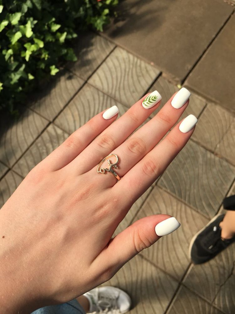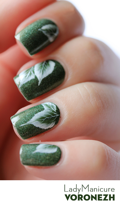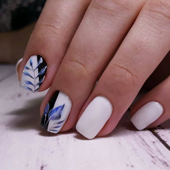 Білі листочки чудово виглядають на темному тлі. Вони подовжують ваші пальчики, надаючи жіночій ручці витонченості. Завдяки контрастному панелі, листочки будуть чудово виглядати при будь-якому випадку і обстановці. Цей універсальний варіант підійде дамам різного віку. В стильному нейл-арте легкість і жіночність малюнка підкорює своїм неперевершеним зовнішнім виглядом.