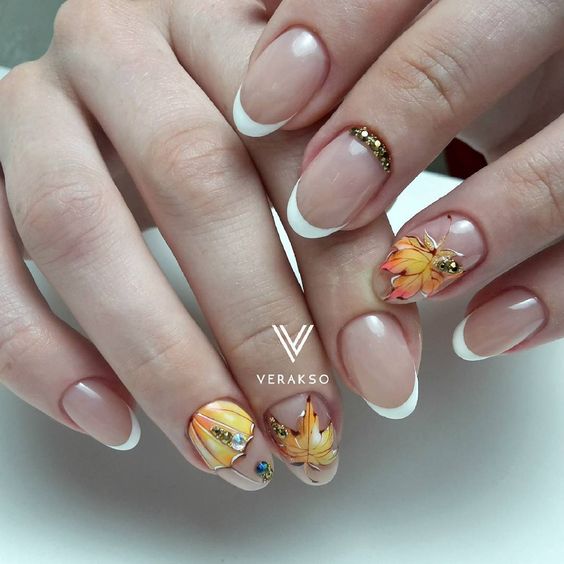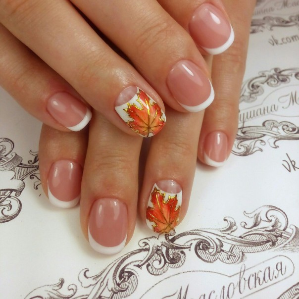 Оригінально виглядає френч з червоно – помаранчевими кінчиками. Що б намалювати листочок на класичному дизайні, можна скористатися трафаретом або намалювати вручну, використавши тоненькі кисті. Для кленових листочків краще підійдуть червоні або оранжеві кольори. Кінчики можна посипати золотими блискітками. Шикарно виглядає картина з листя на світлому фоні. Можна підібрати наклейки або зобразити листя могутнього дуба, ніжною берізки. Такий манікюр підходить для витончених дівчат, які вибирають світлі тони і френч для свого образу.