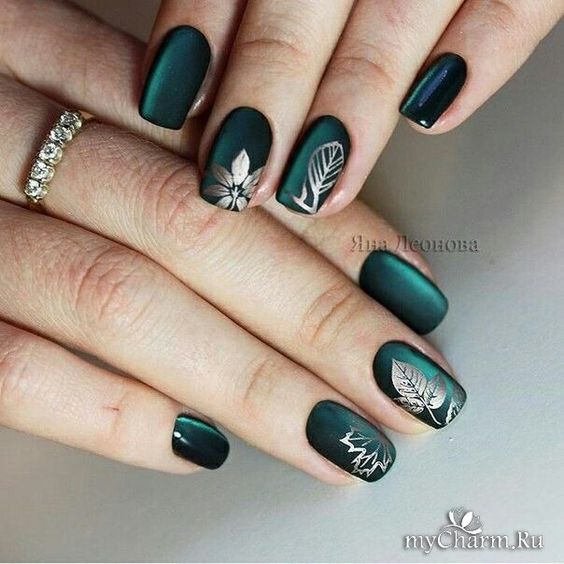 Зелені фарби виглядають на нігтиках дуже солідно і відмінно підійдуть для ділових дам, які перебувають у відпустці. На монохромних нігтики малюнок листя монстери отримує загадкове, приглушене сяйво. Манікюр з чорними або зеленими листочками даної рослини з матовим поєднанням додасть жінці шарму. Візерунок виглядають виразно і чітко.