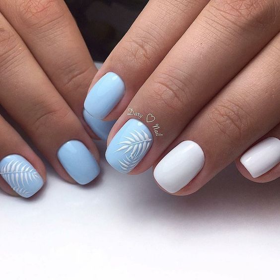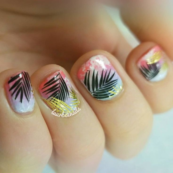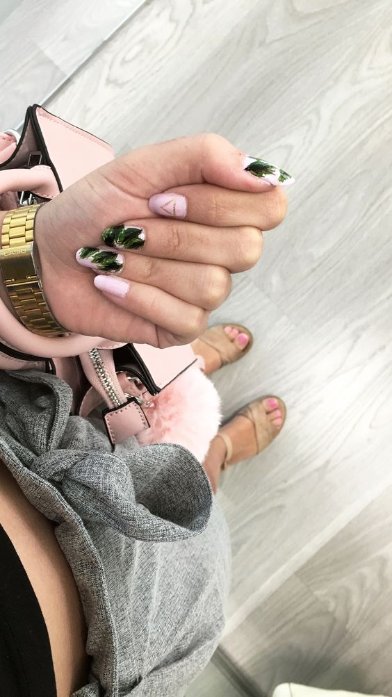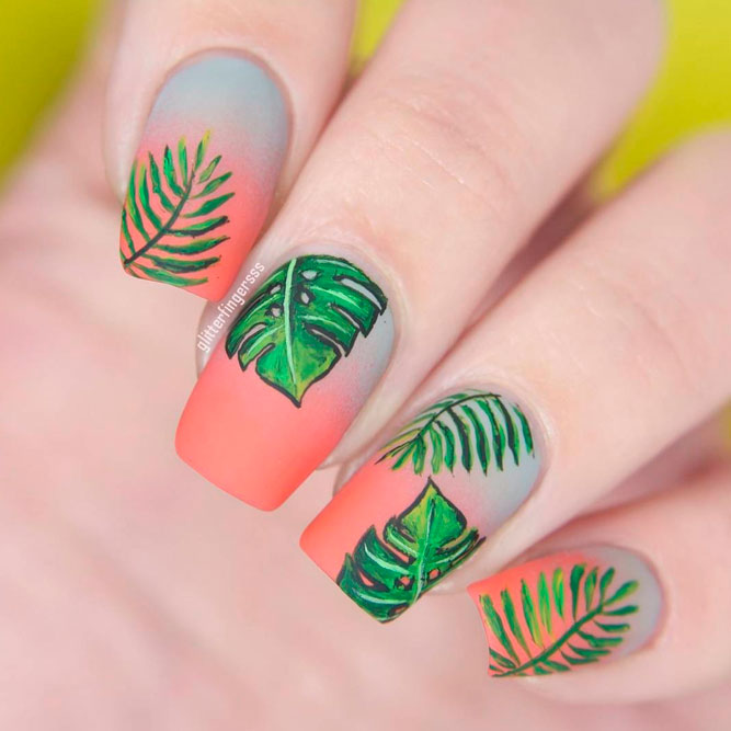 Для літнього манікюру можна підібрати різні листочки. Наприклад, з пальмами – це завжди виглядає яскраво і ефектно. Такий манікюр відмінно підійде для відпустки в жарких країнах, і абсолютно не важливо, чи їдете ви відпочивати влітку або взимку. Нейл арт з листям пальми и – відмінна можливість втілити в реальність ідеї і думки. Подивіться, як чудово виглядає варіант зображення пальм не тільки на тлі блакитного неба з білосніжними хмарами, але і при заході сонця. Сучасний манікюр з листям буде ідеально виглядати на будь-якому пляжі в жарких країнах. Дуже стильно виглядають різнокольорові листя пальми на однотонному тлі, відтінок яких може бути абсолютно різним. Незвично виглядає виконання листя пальми в пастельних тонах.
