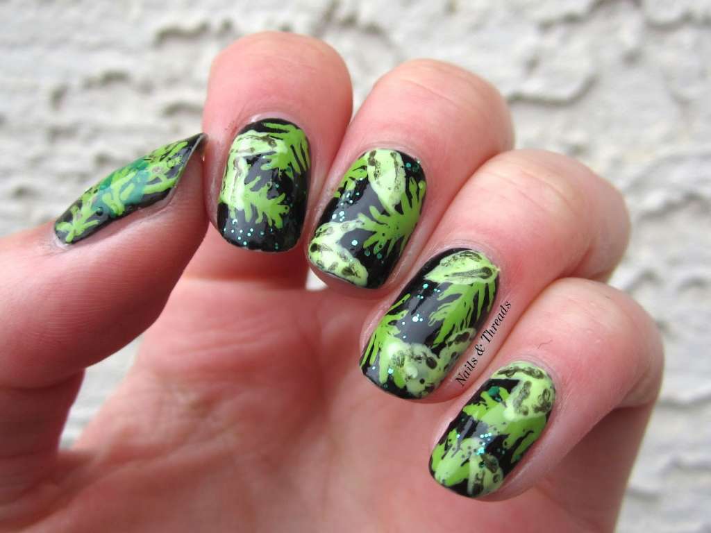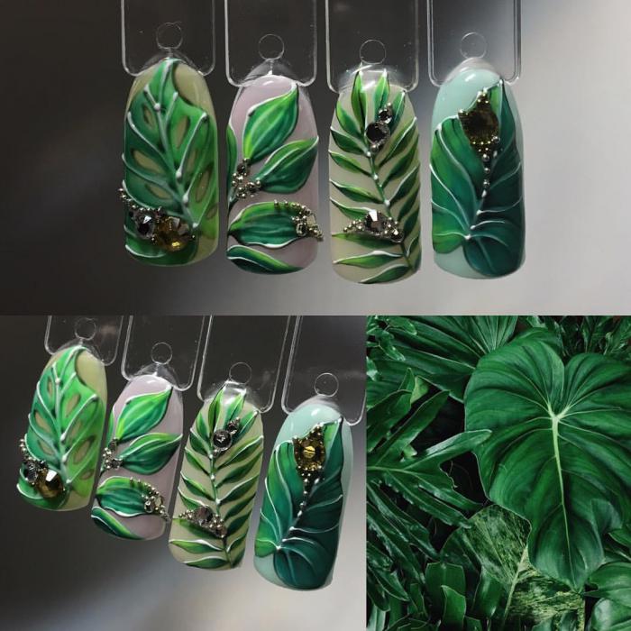 Опуклі візерунки тропічних листя надають ноту оригінальності в образ дівчини. Рельєф виконують різними способами. Домогтися обсягу малюнка дозволять різні техніки нейл-арту, з допомогою яких можна отримати ефект рельєфу самого нігтика. Для доповнення вишуканості тропічних листю варто спробувати варіант прикраси стразами.