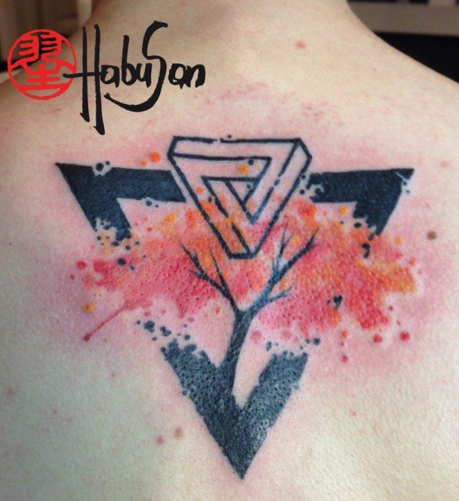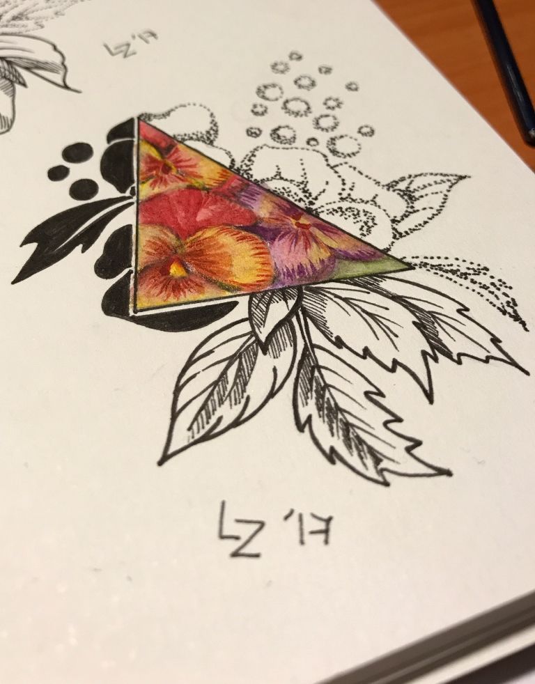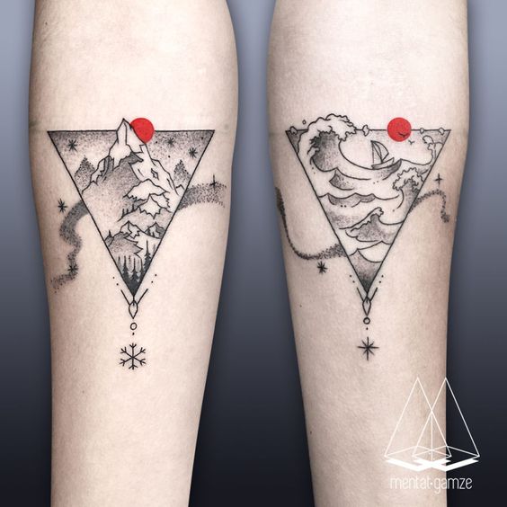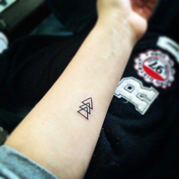 Звичайний рівнобедрений трикутник зустрічається вкрай рідко в якості ескізу. Зазвичай його доповнюють різні композиції і малюнки, хоча мінімалістична виконання трикутника виглядає дуже акуратно. Існує маса різноманітних ескізів, в яких трикутник є основним елементом. Гострота кутів трикутника на тілі компенсується за рахунок супутніх деталей, які в основному виконані у плавних обрисах. Наприклад, якщо в трикутнику зображено дерево, то це означає лише те, що володарка любить і цінує життя у всіх її проявах. А лінії, які обмежують зображення дерева, що символізують циклічність. Серед різних варіантів ескізів тату з трикутниками обов’язково можна знайти підходящий.