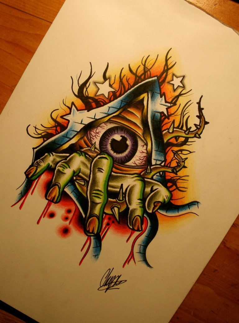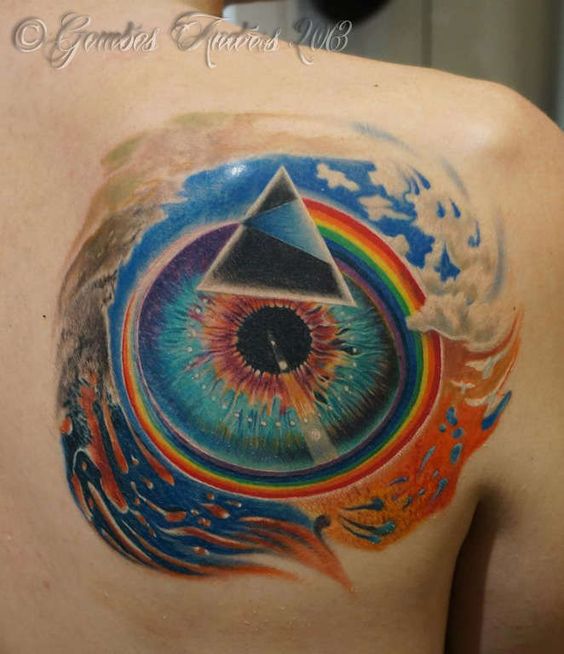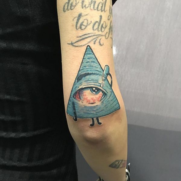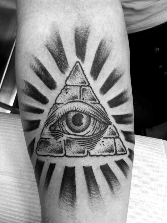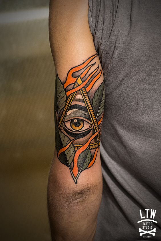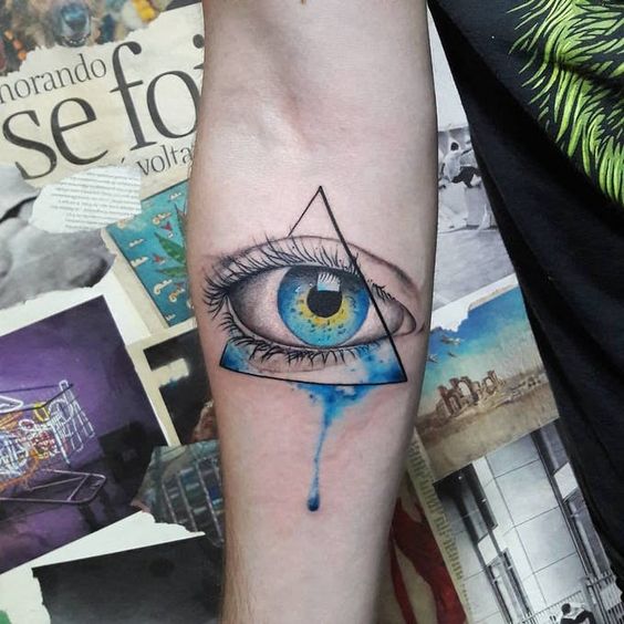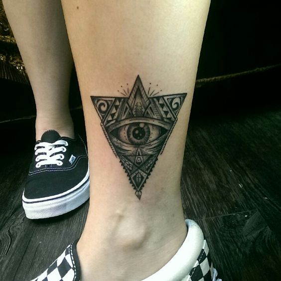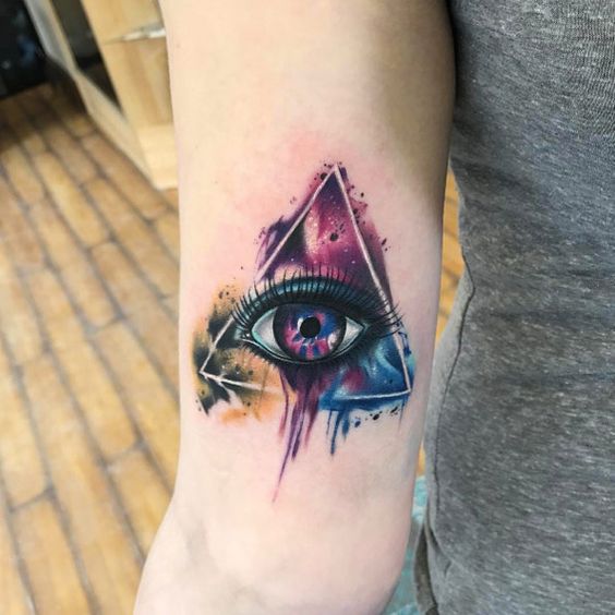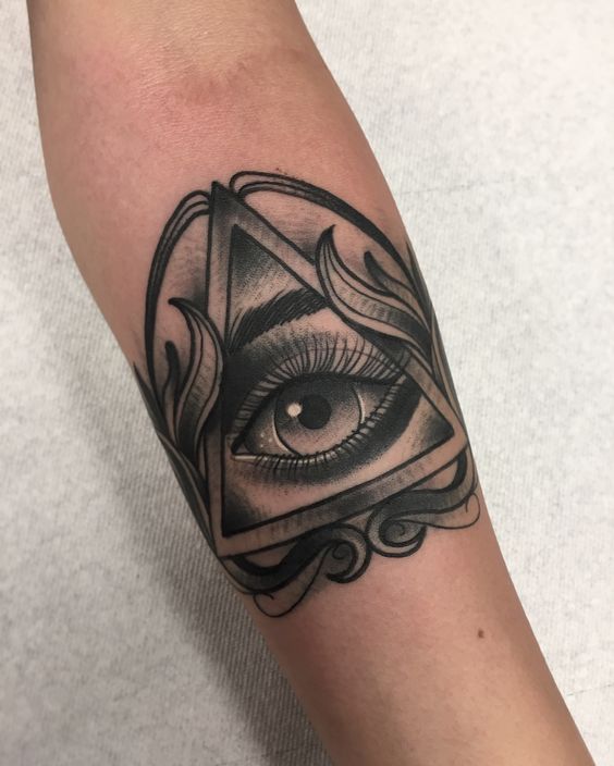 Найпоширенішою татуюванням трикутника є його зображення з оком посередині, отаке всевидюче око. Дивлячись на зображення тату з оком в трикутнику, виникають суперечливі почуття, які властиві містицизму і нез’ясовних явищ. Значення даного зображення трактується як осяяння або просвітлення свідомості, хоча зовні око обмежується сторонами трикутника. Специфічні напрямки в релігії беруть малюнок у вигляді ока в трикутнику в якості основи для своїх символів, адже у кожної релігії своє бачення на навколишній світ. Багато культури вважають тату трикутника з оком всередині символічним зображенням, призначеним споглядати за всім, що відбувається.