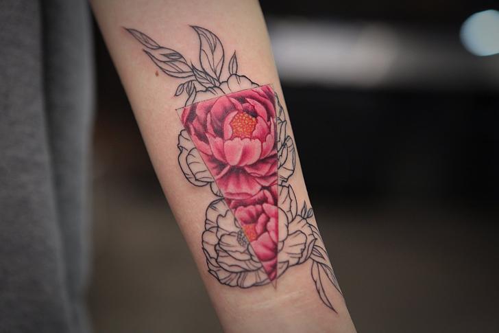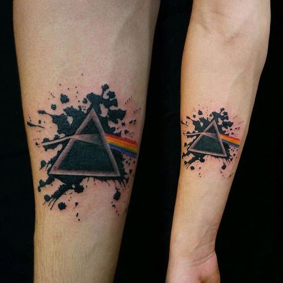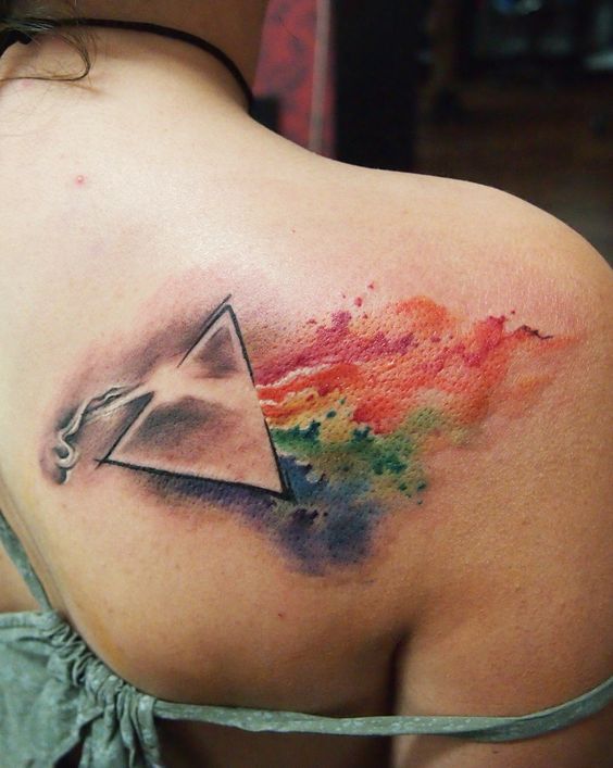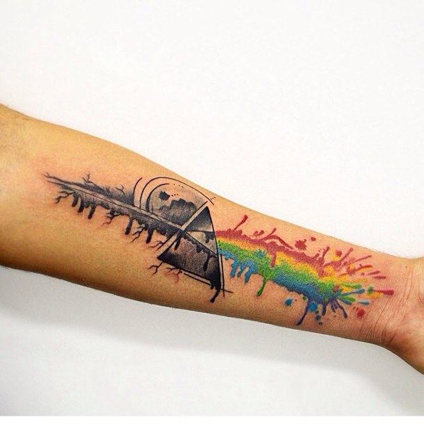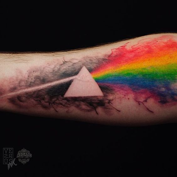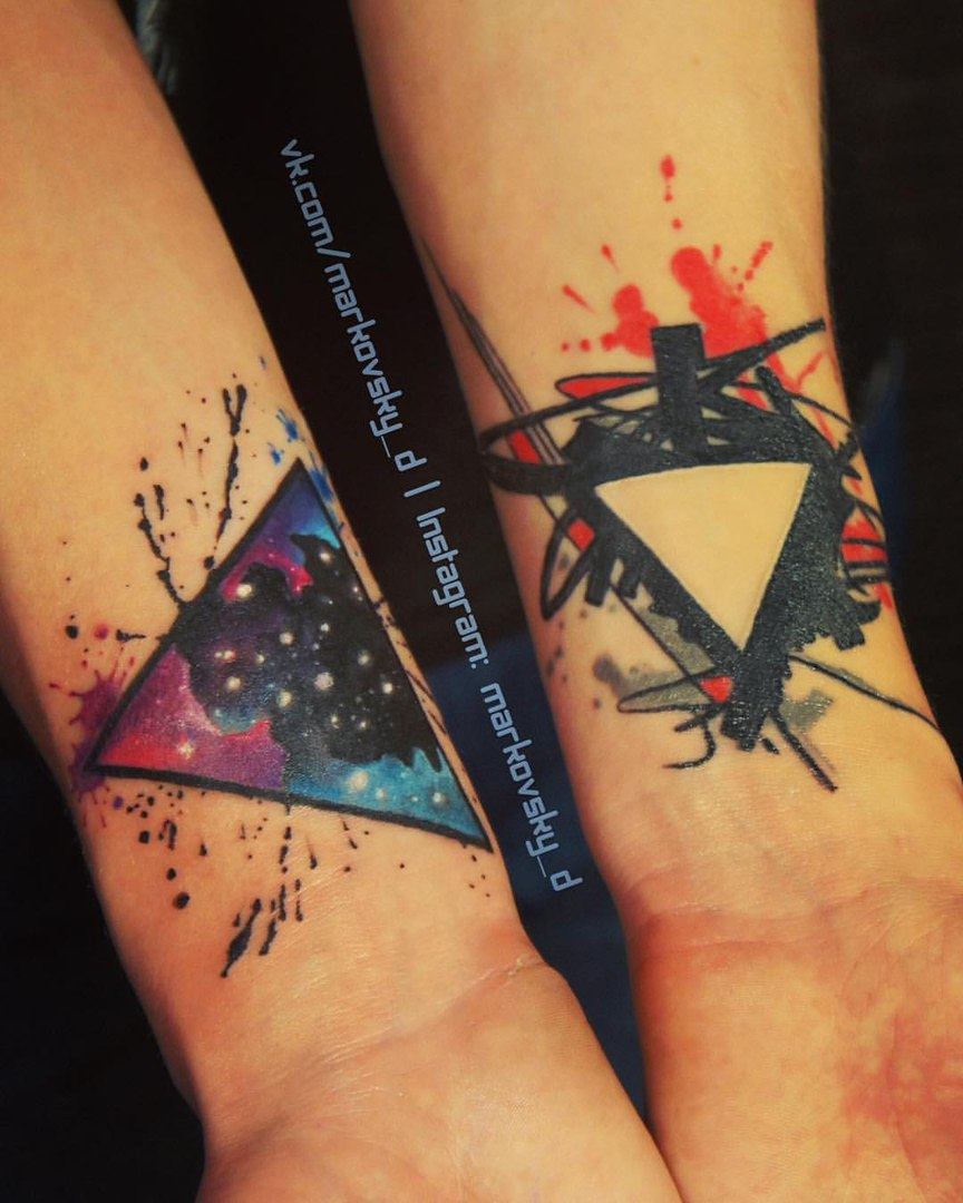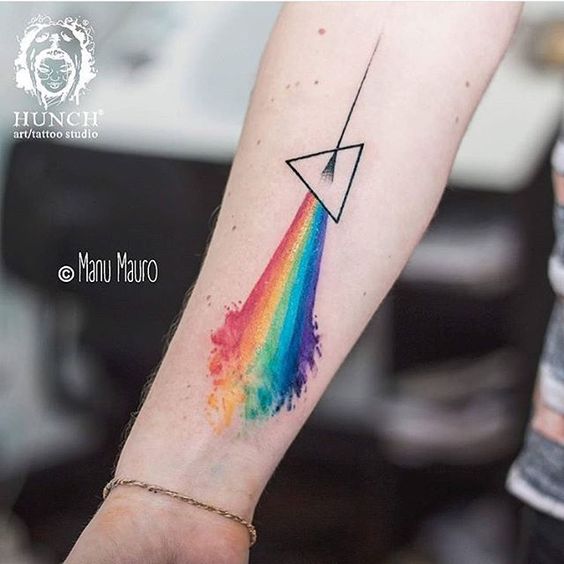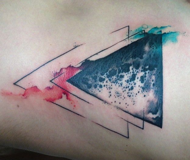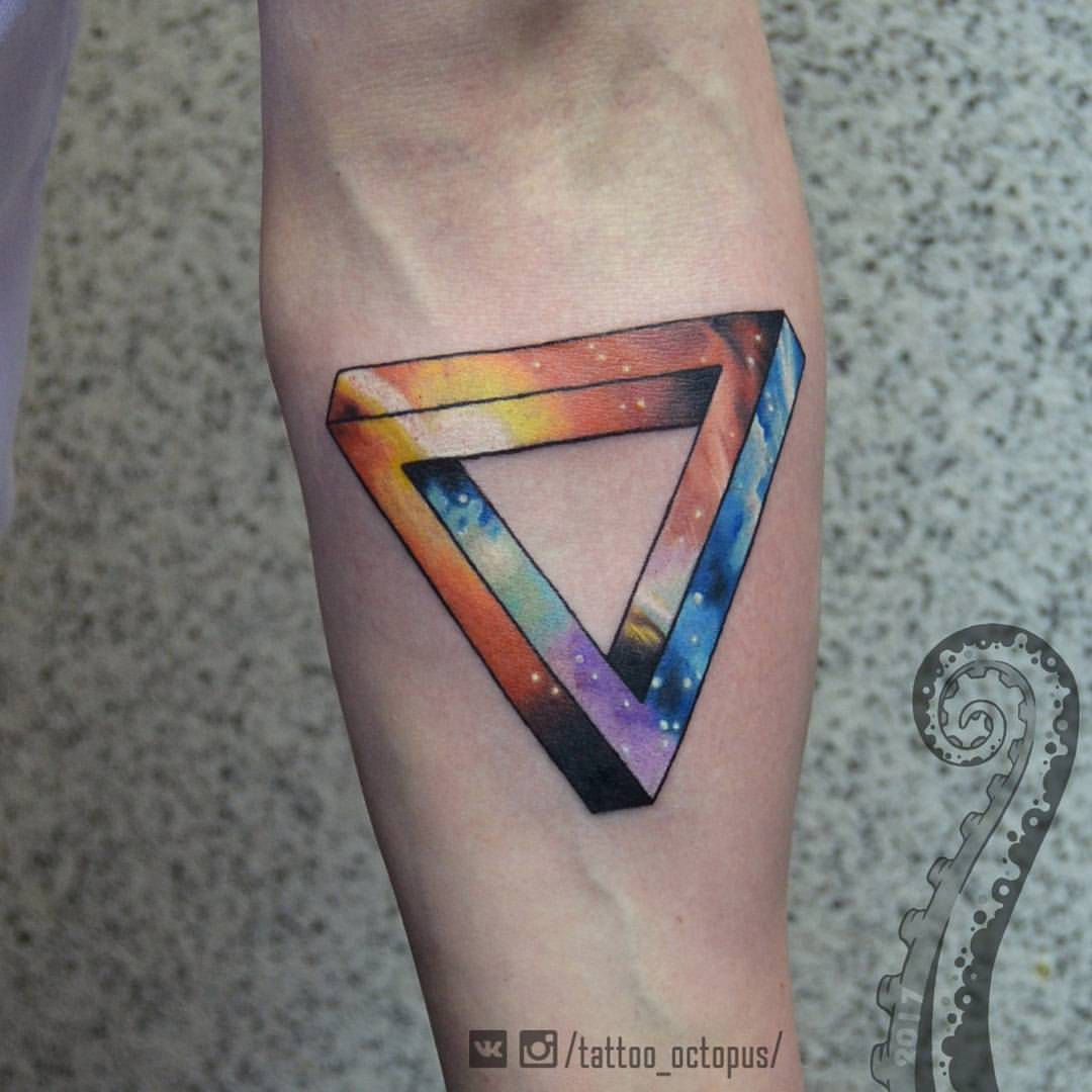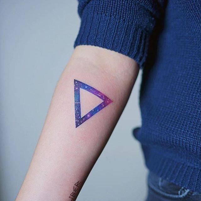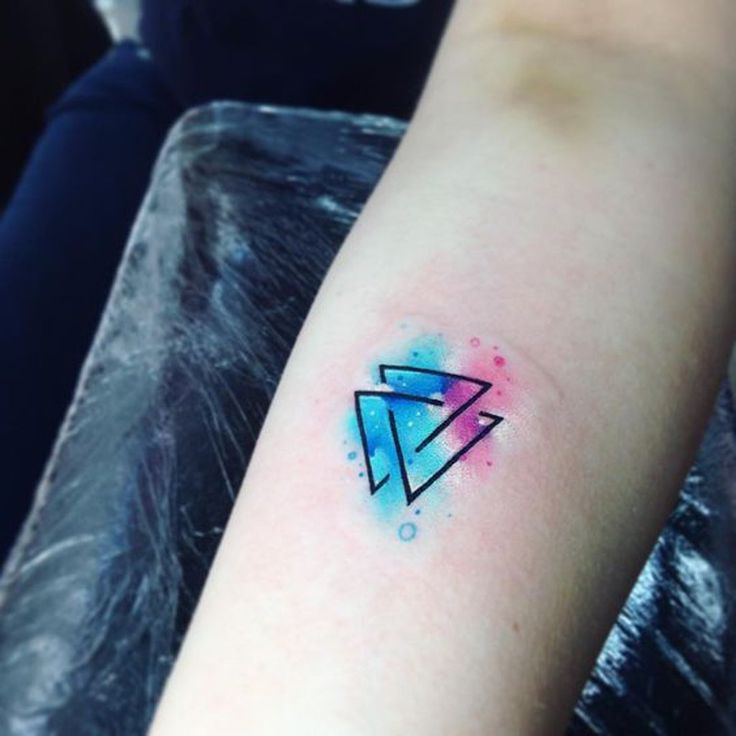 Більшість прикладів татуювань з трикутником на руці виконані кольоровими чорнилом. Особливо ефектно на зап’ястях виглядає тату трикутника в акварельній техніці. Незвичайний натільний дизайн підійде дівчатам, які не сумують за життя, а намагаються все бачити через різнобарвну призму щастя. Якщо говорити про чорному варіанті тату на руці, то трикутник в даному форматі виглядає акуратно, що, в будь-якому випадку, вже вважається модним.