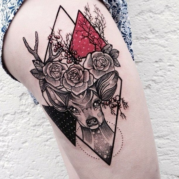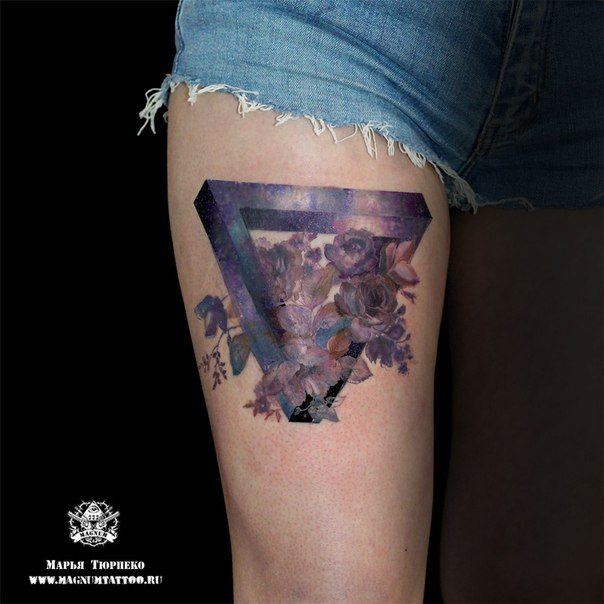 Цікаво і оригінально виглядає тату трикутника на ногах дівчат, причому в будь-якій її частині. На стегні намагаються зробити татуювання побільше, а в районі щиколотки зустрічаються більш мінімалістичні зображення. Модні композиції з різнобічними і рівносторонніми трикутниками на ногах, як і на багатьох інших частинах тіла, прикрашаються додатковими елементами. Кольорові зображення тварин, квіткові композиції або незрозуміла абстракція виглядає на нозі досить ефектно, особливо якщо тату зроблено якісно і зі смаком.