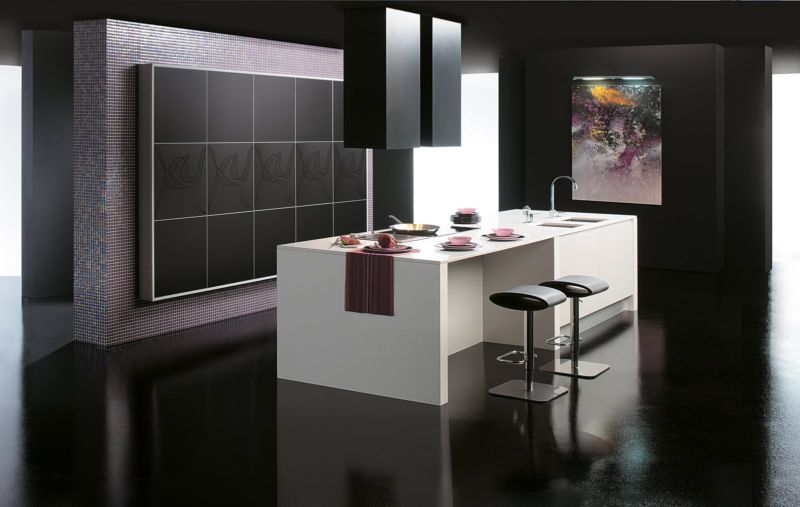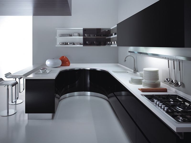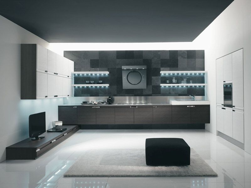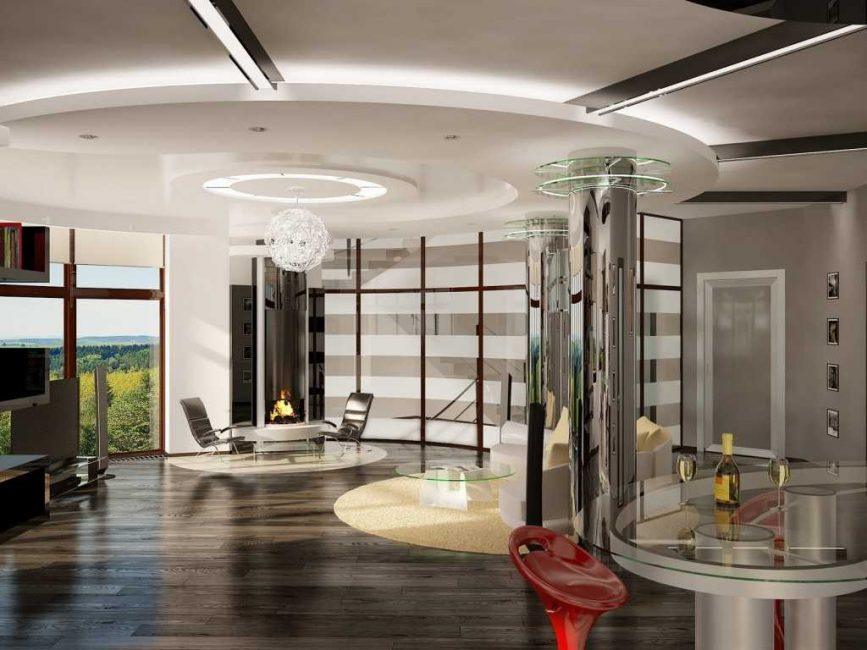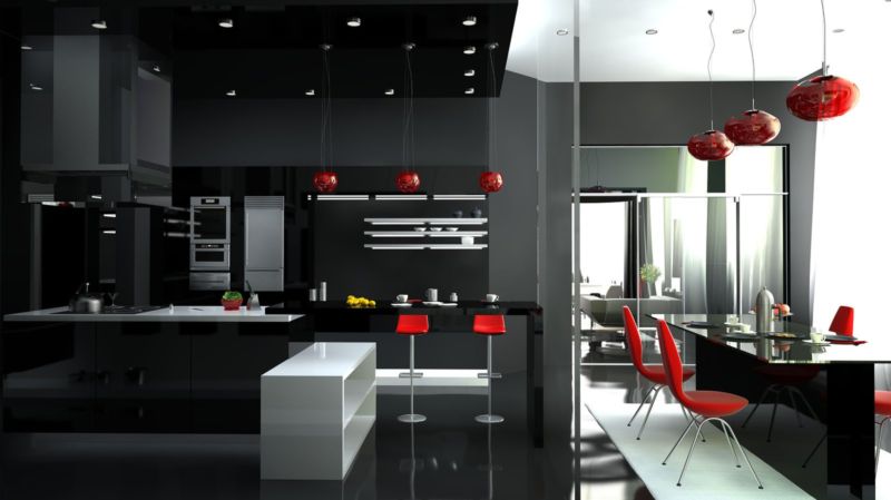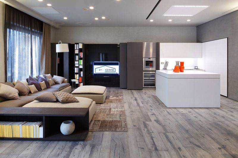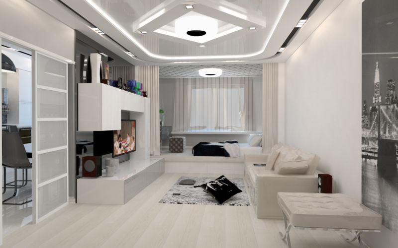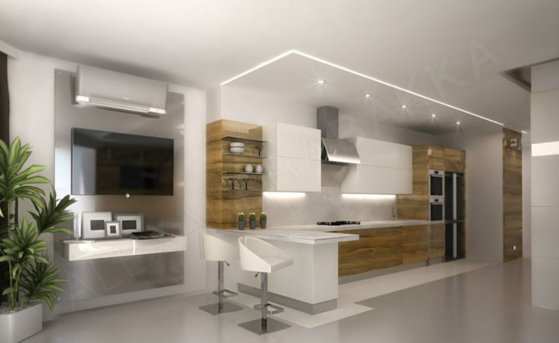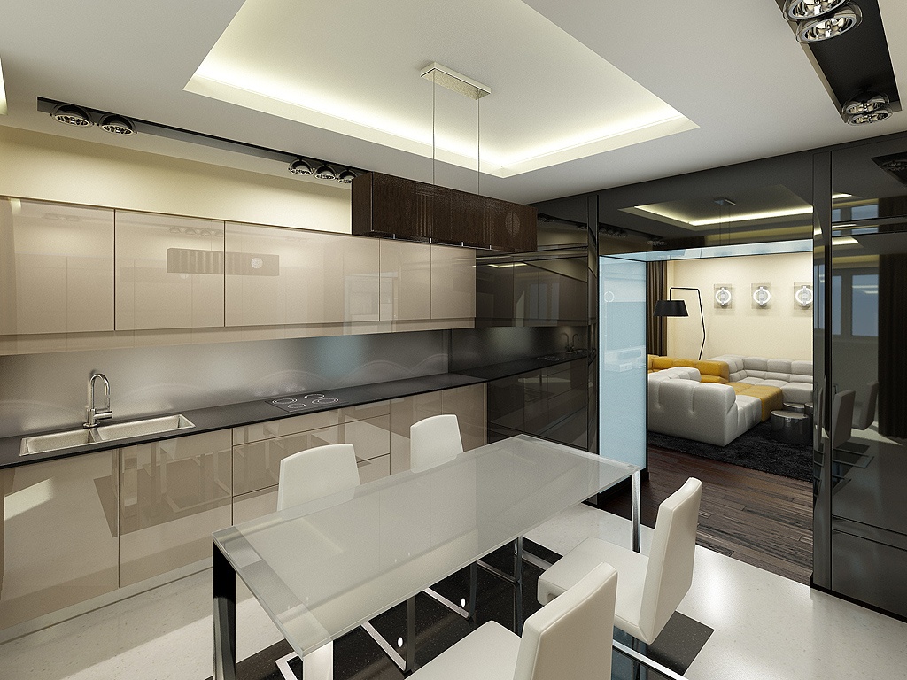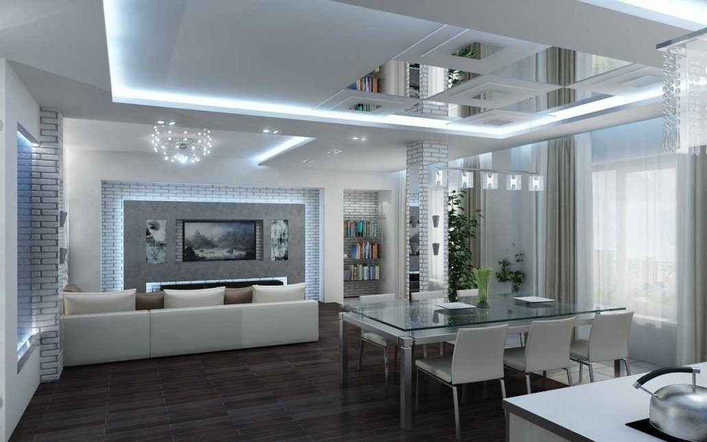 На тлі матовою стіни буде добре виглядати заливний глянсовий підлогу. Створять креатив і футуристичний образ підвісні шафи і хитромудрі лампи. Любителі кіно і якісної музики можуть у вітальні встановити аудіосистему. Барна стійка створить паралель між місцем приготування їжі і вітальні.