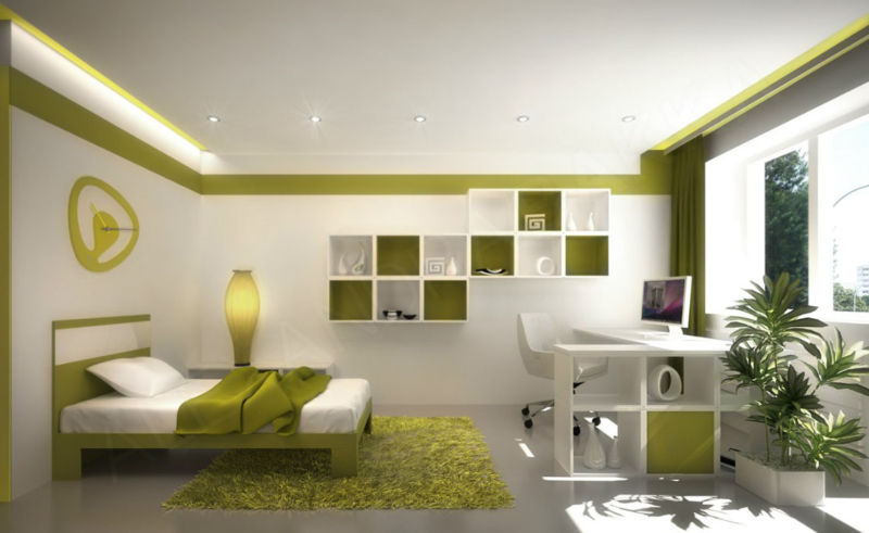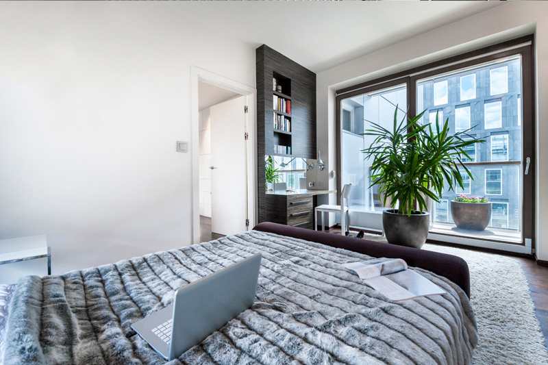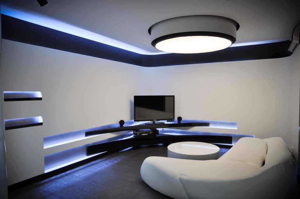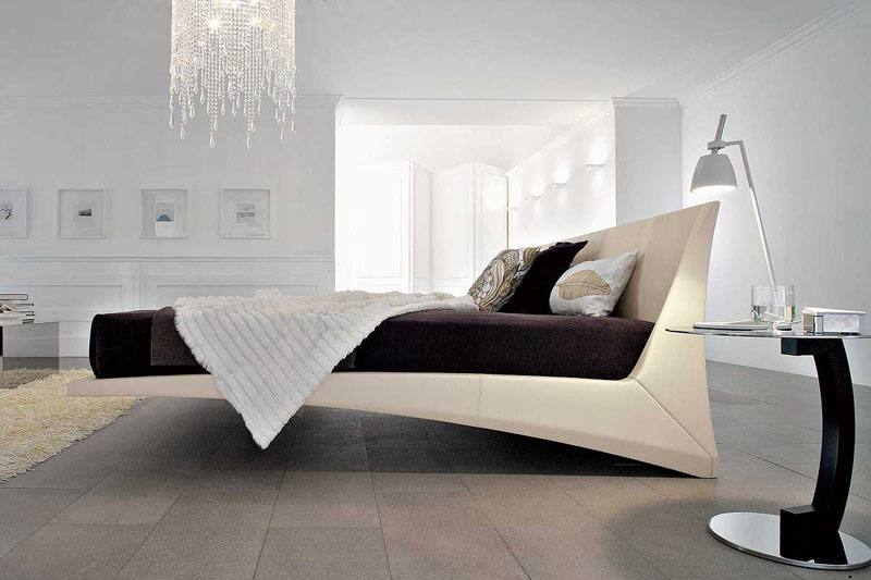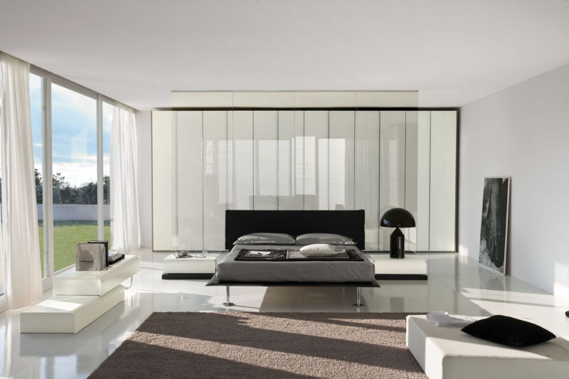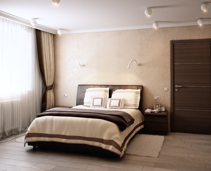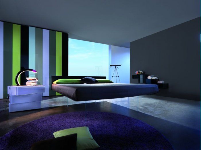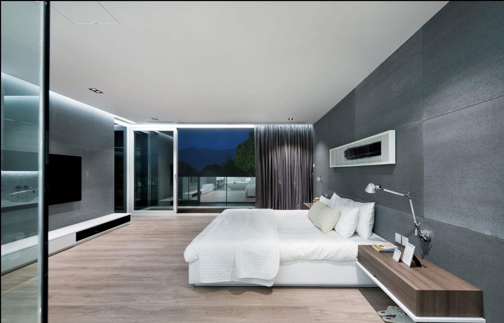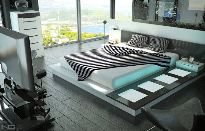 У спальні колірна гамма підбирається ненав’язлива і легка. Оттеняющий колір на стінах може бути ліловий, блакитний, світло-сірий. Вікна закриваються щільними шторами з допомогою автоматичної системи. Модель ліжка підбирається без ніжок з нижнім підсвічуванням.