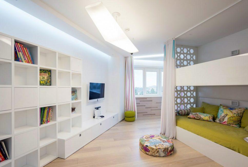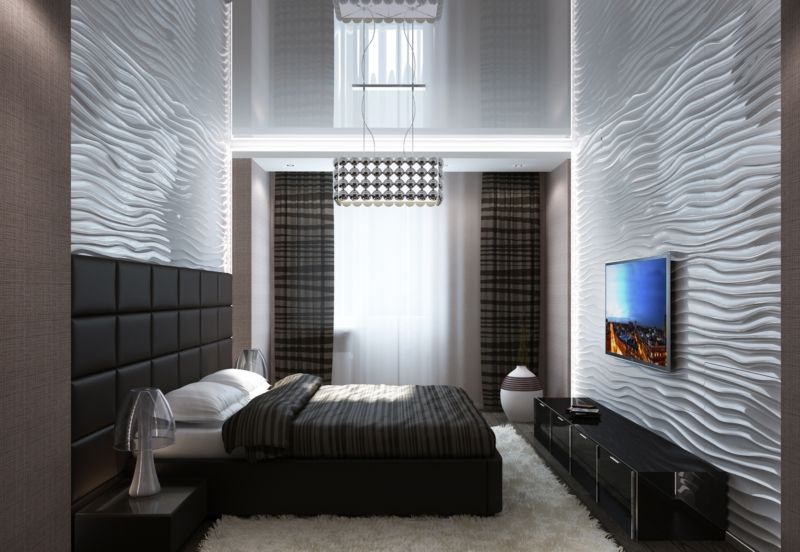 З меблів допускається пара приліжкових тумб. В стіні вбудований телевізор. Покриття на підлозі слід вибирати ненав’язливе і щільне.
