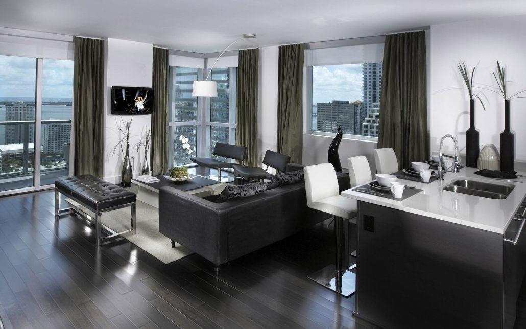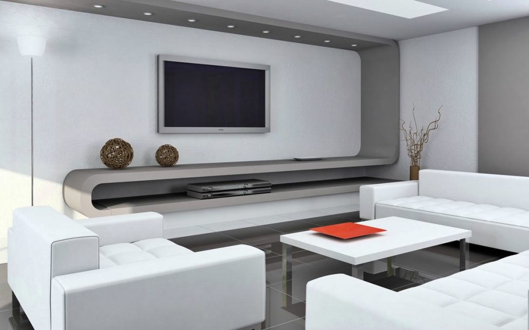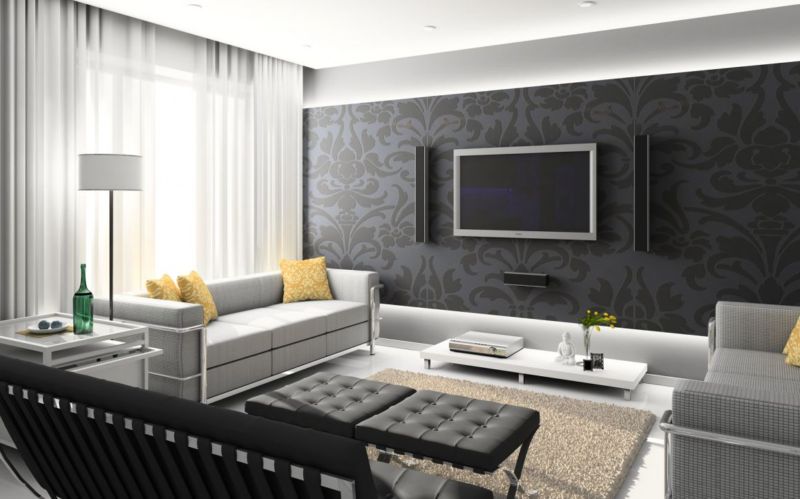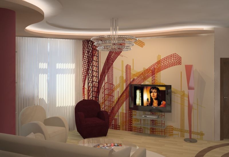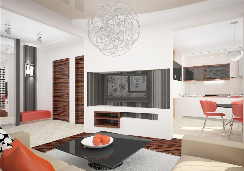 У вітальні зонувати простір необхідно грамотно. Тут повинен бути м’який куточок або крісла навколо лаконічного дивана. Буде до речі дизайнерський стіл зі скляними і металевими деталями. На підлозі – килимове покриття, на стіні розташований широкоекранний телевізор.