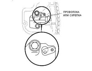 4. Після установки відрегульованої ланцюга, зняти дріт або канцелярську скріпку, встановлену на натяжителе ланцюга і дати натяг на ланцюг ГРМ. (Зняти встановлений стопор коли встановлюється новий натягувач ланцюга.)