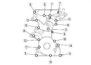 3. Затягти за допомогою динамометричного ключа, монтажні болти передньої кришки двигуна в порядку, зображеному на малюнку трохи нижче.