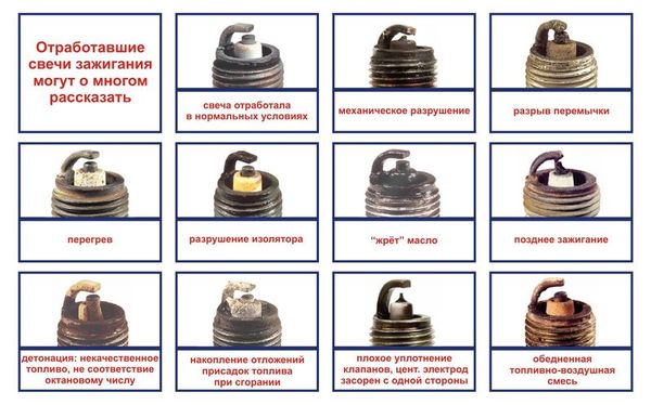 Стан свічок визначити за зовнішнім виглядом не так складно. Термін служби цих елементів становить близько 20 тисяч км пробігу, але в даному випадку все залежить від самих СЗ та умов їх експлуатації. Причин може бути безліч, в залежності від кольору нагару. Але, як правило, всі вони пов’язані з нестабільною роботою двигуна.