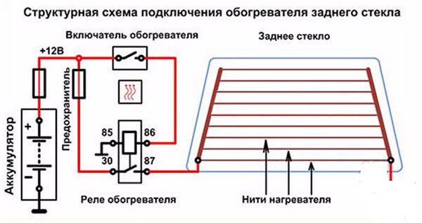 Принцип роботи обігрівача скла автомобіля полягає в натисканні водієм кнопки, розташованої в салоні транспортного засобу, і надалі обігріві скла. Саме харчування на систему надходить з позитивного висновку автомобільного акумулятора — напруга в даному випадку діє через запобіжні елементи і замок запалювання. У кінцевому рахунку енергія подається на контролер девайса, а також контакт реле. Негативний контакт системи з’єднується з масою автомобіля, тобто його кузовом.