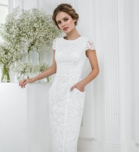 Дуже популярна на весіллях нестаріюча класика – приталені білі сукні-футляри традиційного крою, довжиною до коліна і без рукавів, з акуратним напівкруглим вирізом і лаконічним дизайном. У такому вбранні наречена виглядає дуже жіночно і привабливо.