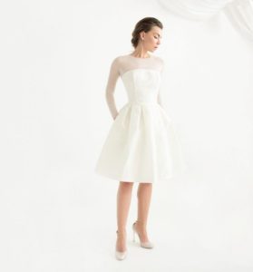 Модель до або трохи вище коліна – найкраще рішення для мініатюрних дівчат. Воно надає образу романтики, ніжності, підкреслює тендітність і жіночність. У поєднанні з взуттям на високому каблуці подібний наряд допоможе нареченій виглядати вище і стрункіше.