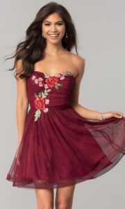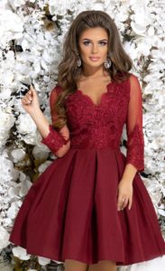 Бордове плаття довжини до або трохи нижче коліна буде доречно виглядати на випускному в 9 класі, підкреслить молодість і природну красу юної випускниці.