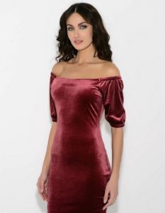 Облягаючу сукню відтінку бордо з відкритими плечима (виріз «кармен»):