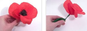 По одній пелюстці починають з допомогою клею приклеювати їх до отриманої чорної серцевині, створюючи бутон маку. Дріт обмотують гофрованої зеленою смугою. Місце приклеювання пелюсток також приховують під зеленим папером. Доповнюють отриманий стебло листям.