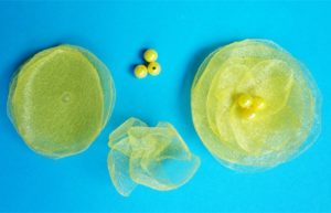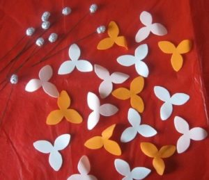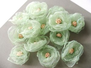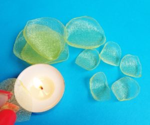 З шматка органзи необхідно вирізати 5 кіл і 6 деталей, за формою нагадують пелюстки. Щоб тканина не розповзалася, її краю обпалюють над полум’ям свічки.