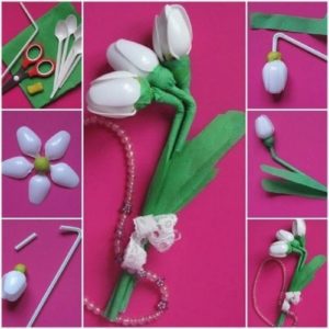 Процес виконання починають з обрізання ручок від ложок. Потім з пластиліну формують невеликі кульки, які будуть тримати ложки-пелюстки. У них вставляють обрізані ложки і трубочку. Обмотують трубочки смужкою із зеленого паперу. Вирізують також із зеленого паперу листя, закріплюють їх на отриманий стебло. Збирають букет з готових тюльпанів, зав’язують декоративною стрічкою.