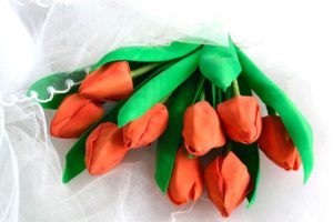Досить натурально виглядають композиції з квітів на 8 Березня, з фоамирана. Цей матеріал придатний для виконання будь-яких кольорів, але найбільш красивими виходять тюльпани.
