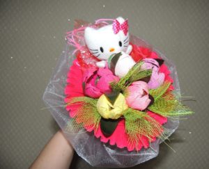 Як би дивно це не звучало, але букет на 8 Березня своїми руками можна зробити не тільки з квітів, але і з інших сувенірів.