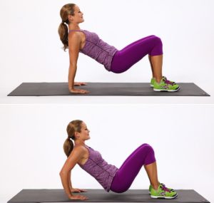 - Віджимання (від опори). Можна використовувати будь-яку поверхнею, що характеризується стійкістю і знаходиться позаду на 1-2 кроки. Слід покласти на опору руки, перенести вагу тіла, зігнувши ноги для зручності. Таз акуратно опускається вниз так, щоб він не торкався підлоги. Потім потрібно піднятися. Вправа виконується близько 20 разів.
